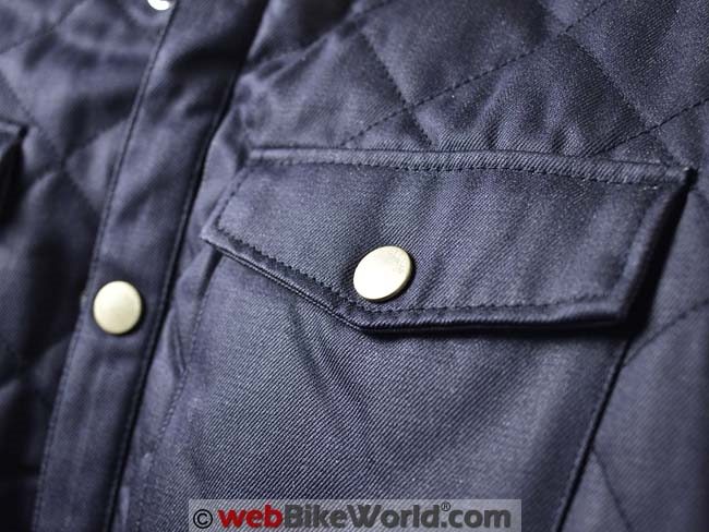 Notable external features of the Westport overshirt include the brass snaps with tiny molded “REV’IT!” text. The snaps set off the color very nicely. And guess what? The bottom snap is hidden under the fabric hem, so you can still fasten the bottom of the jacket without a metal snap carving your initials in the gas tank. The external seams down the arm and other locations are triple-stitched, which should provide good seam strength.