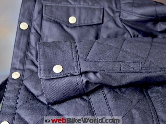 That’s right, the collar has hidden metal snaps underneath each point to prevent the wind from pushing it around as you’re riding. The sleeve cuffs look more shirt than jac, with the brass snaps and a normal dress shirt type of opening with no other liner, gusset or zipper underneath.