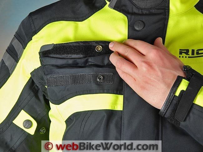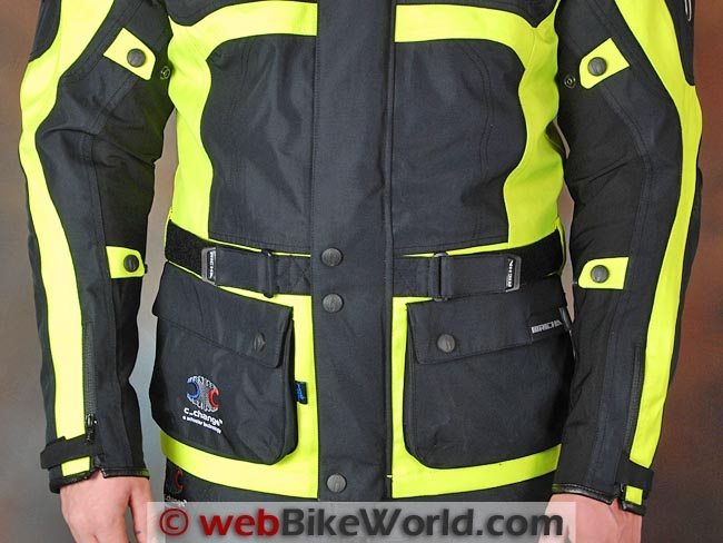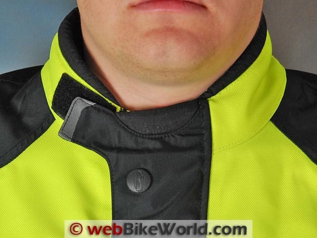 The jacket has a nice, wide adjustment belt at the waist and rubberized button covers. A full-length strip of hook-and-loop secures the front with a double-folded seal along the placket. The neck has a basic hook-and-loop tab that seems a bit out of place on this jacket. It needs more adjustment options and perhaps some type of movable snap, like the system used on the Rev’it jackets. The neck lining in the shell has an exceptionally thick and padded fleece lining.