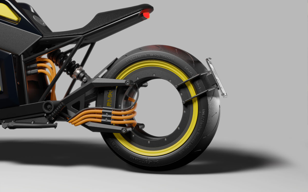 According to RMK, the E2 prototype makes around 67 hp and 236 lb-ft of torque from its hubless rear-drive wheel. RMK claims a top speed of about 99 mph thanks to its unique drive unit. The bike also comes with regenerative braking, and its wheelbase is 63 inches, which New Atlas reports is almost as long as BMW’s K1600GT touring bike.