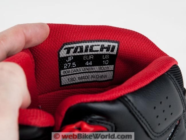 On both sides of the heel there is a large triangular shaped pad with an embossed Taichi label that is about 1/4″ or so thick (though I can’t directly measure it).