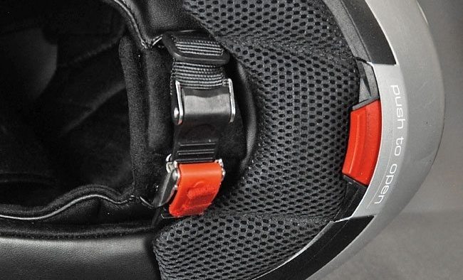 The button that releases the flip-up visor is located under the center of the chin bar, just as it is on the ECE versions of the C3. It’s nearly flush and it is pushed upwards to release the flip-up visor.