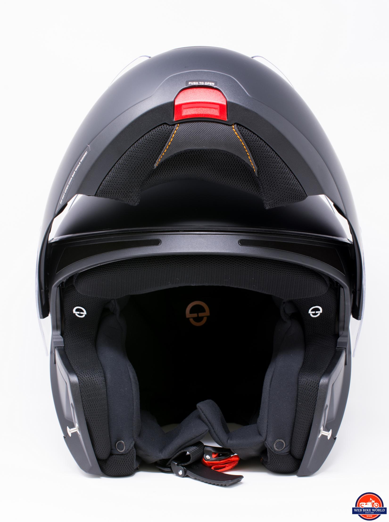 I like that the face shield has tabs on both sides. I also like that the face shield operates with the right amount of resistance. The mechanism is also very precise: you can ride with the visor partially opened and it will stay where you set it. I’ve tried this at speeds just north of 50 mph. If you have a habit of doing this to clear fog, you’ll also be pleased to know that fog isn’t much of an issue on the visor. I’ve gone riding with plenty of rain falling and it hasn’t fogged up. Thanks, Pinlock.