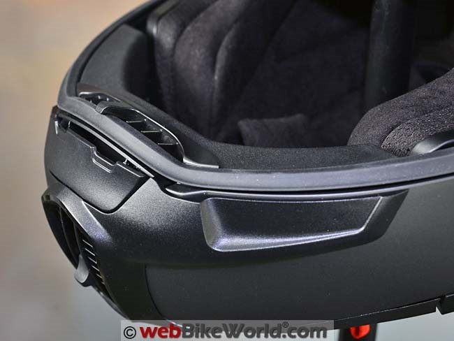 The neck roll SCHUBERTH SRC Bluetooth intercom (review) system is made by Cardo for SCHUBERTH. The E1 has an antenna installed in the shell and it’s ready for the SRC system, which has a list price of $399.00.