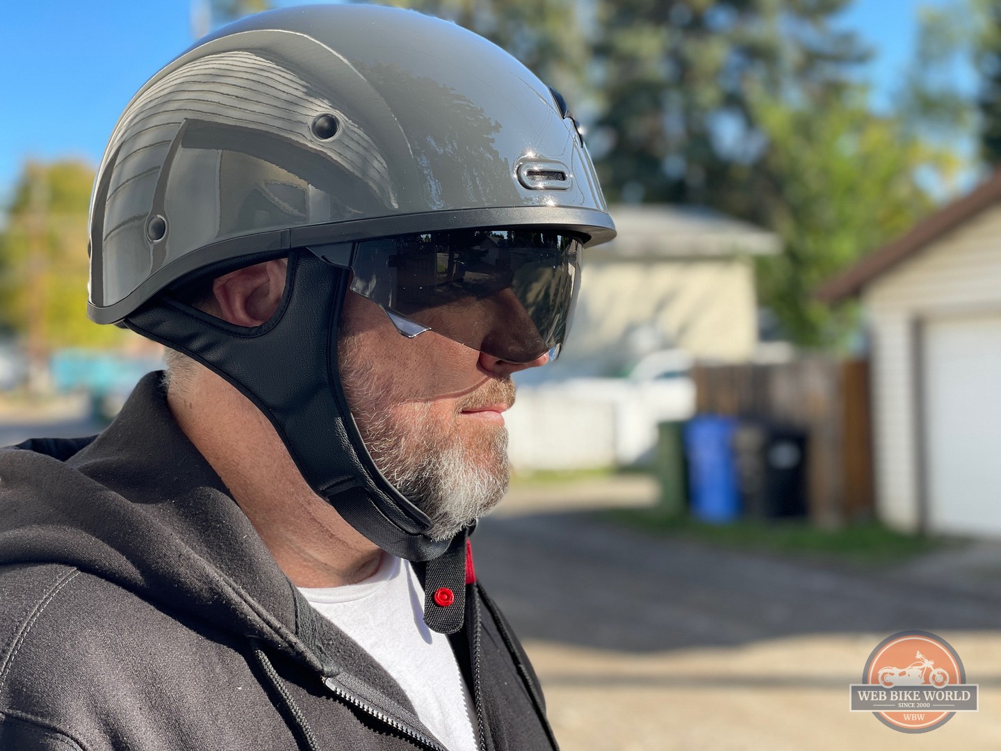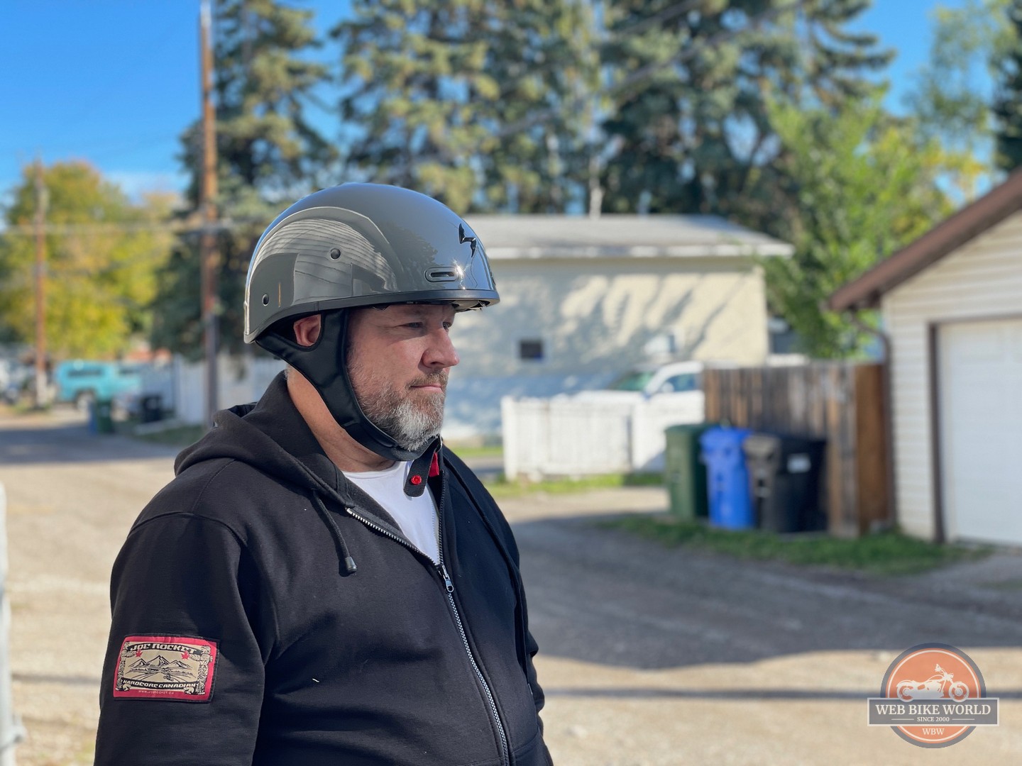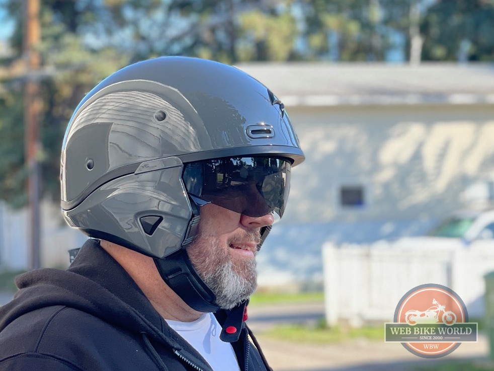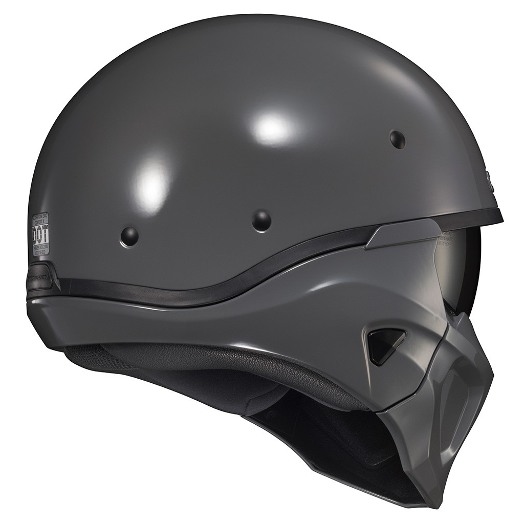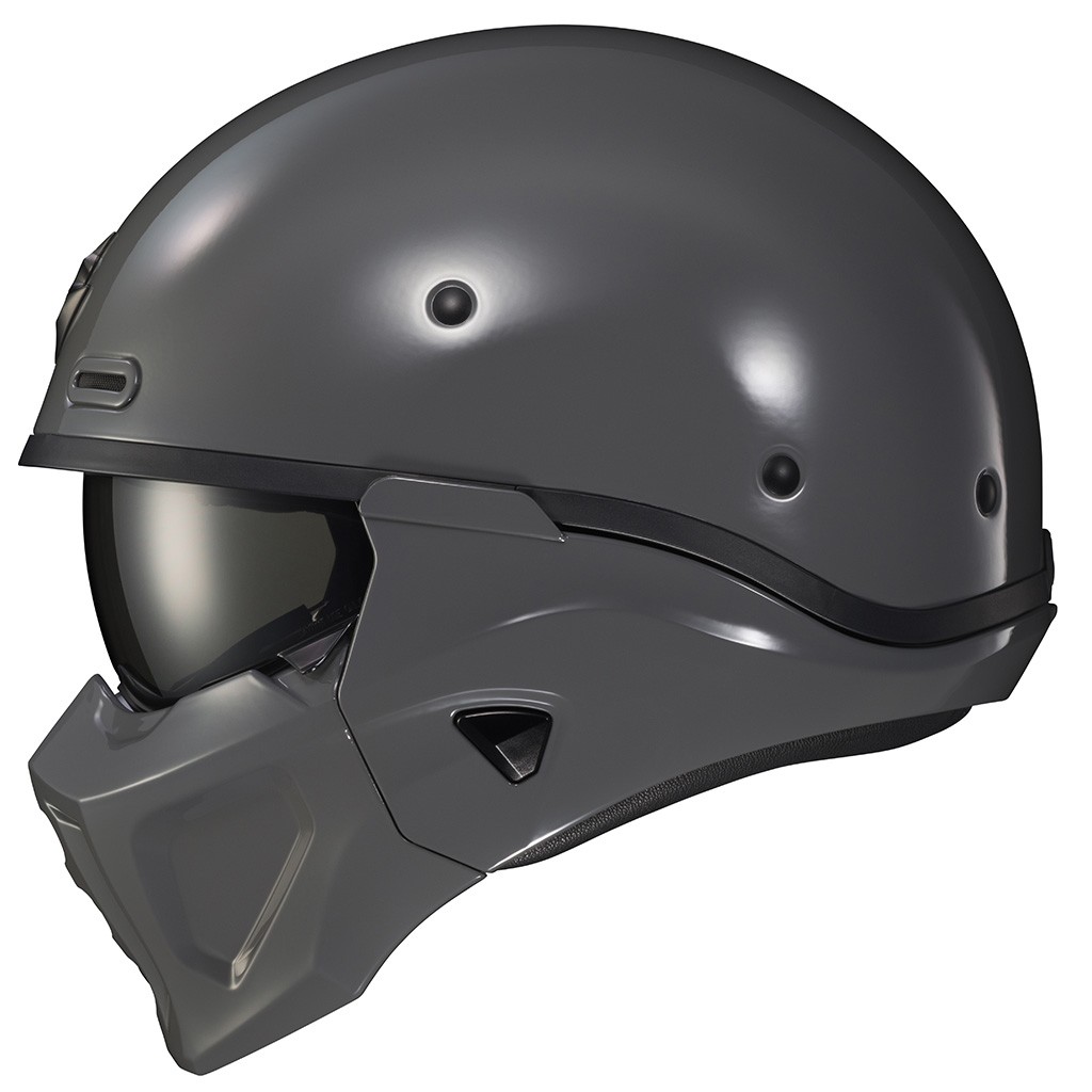 In the ½ helmet mode, it looks okay. Not my favorite looking style but that is very subjective naturally. The Cement Grey color is also very subjective, I happen to love it, but gloss and matte black are available.