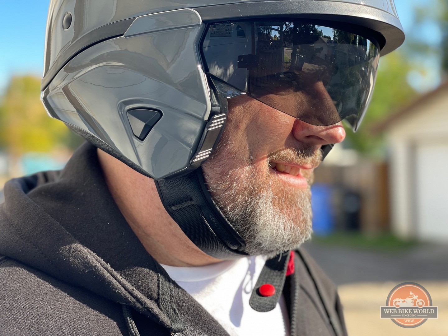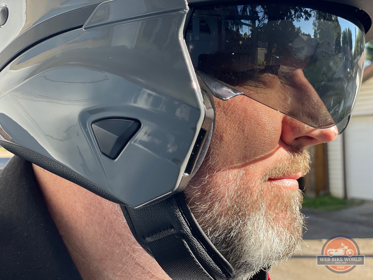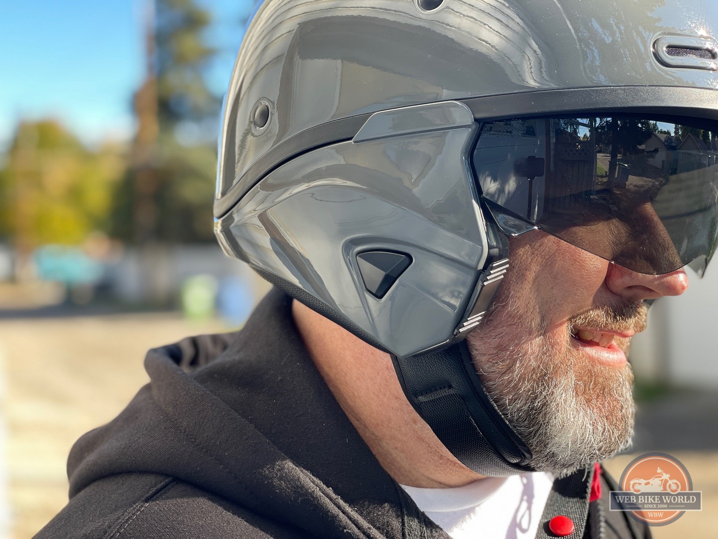 The final visor item to note is discovered when using the Covert X with the chin bar mounted. The visor slides smoothly down and Scorpion provides a detent to hold the visor with a slight “city mode” air gap of about 1 cm. One step further for full closure of the visor which then seals against a gasket to help keep moisture out.