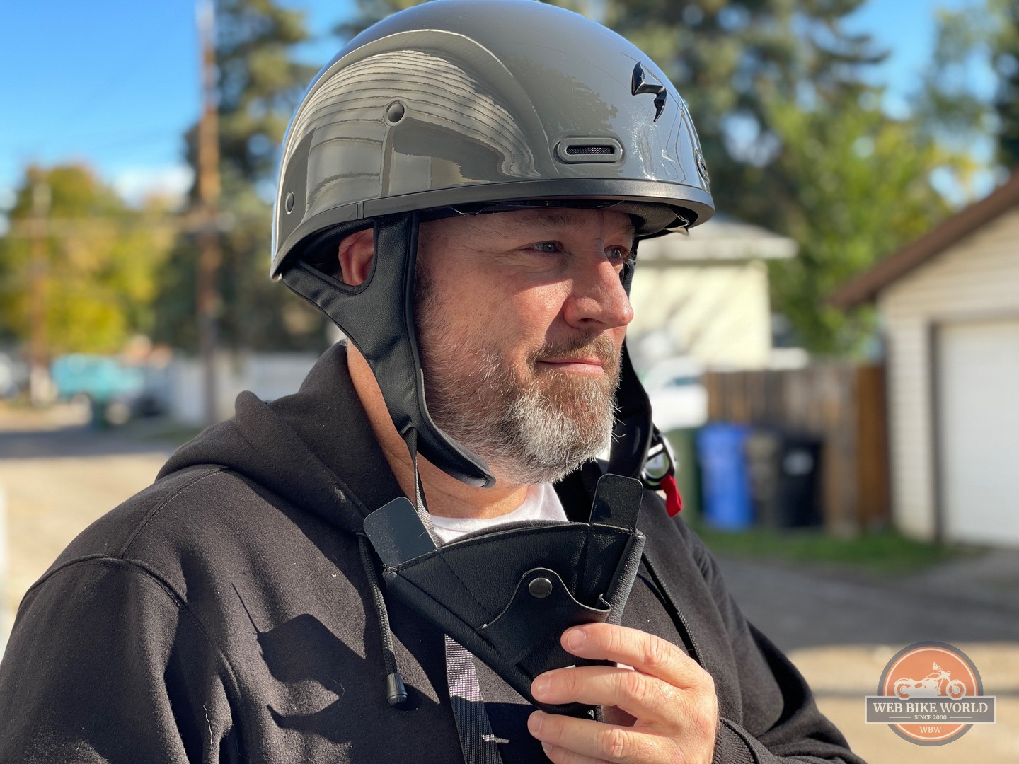 The final thoughtful inclusion from Scorpion is the cold weather ear covers with integrated speaker pockets. They slide over the left and right portion of the chin strap and do a decent job protecting the ears in the ½ helmet mode. The speaker pockets are the same size as the ones in the ¾ section making it a simple matter to fit the speakers from the UClear system.
