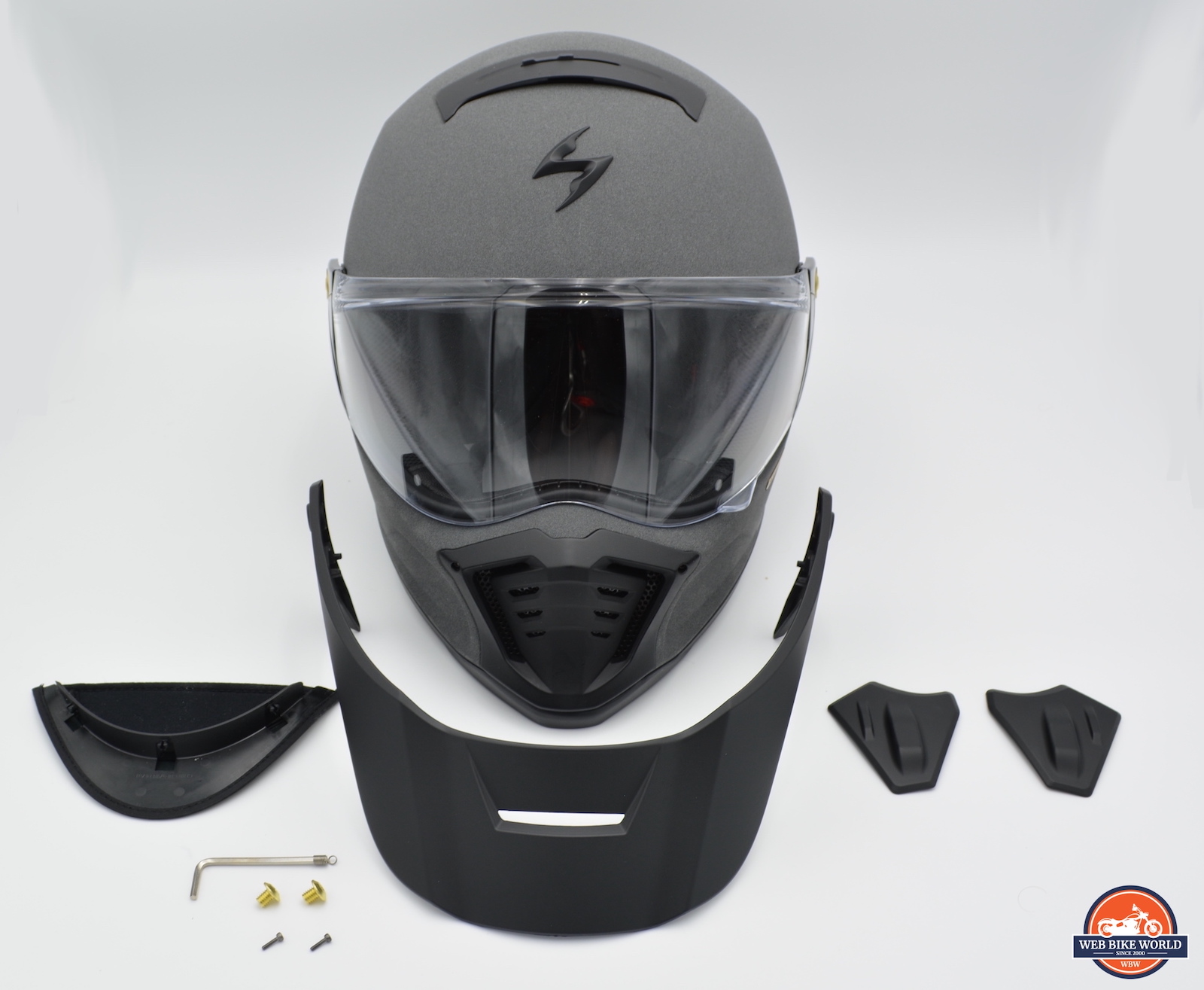 Talking about that visor port, the operation to change out the visor and mount the sun peak can be completed in under 5 minutes if you take your time. The helmet comes with an M3 hex key as part of the packaging, which includes a keyring hoop, and each brass screw only takes about five turns total to remove. The visor simply slides off then, and the peak lands in two homing holes where the visor used to sit, and you reseat the screws and tighten them, and you’re done.