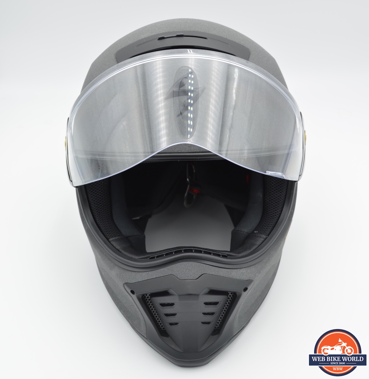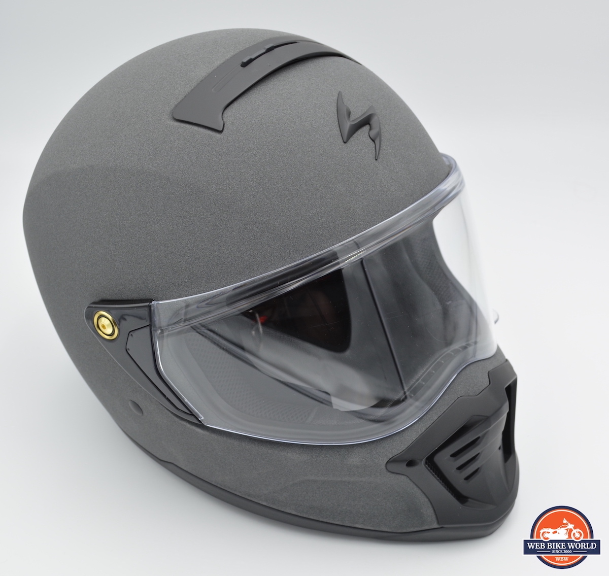 On the outside (at least on the asphalt-colored helmet I received for review), the surface of the helmet is hardy and grippy, almost like micro-stucco. The visor is definitely big and wide, and instead of being mounted on detents, it is mounted with a brass screw on each side, under which lies a magnet.