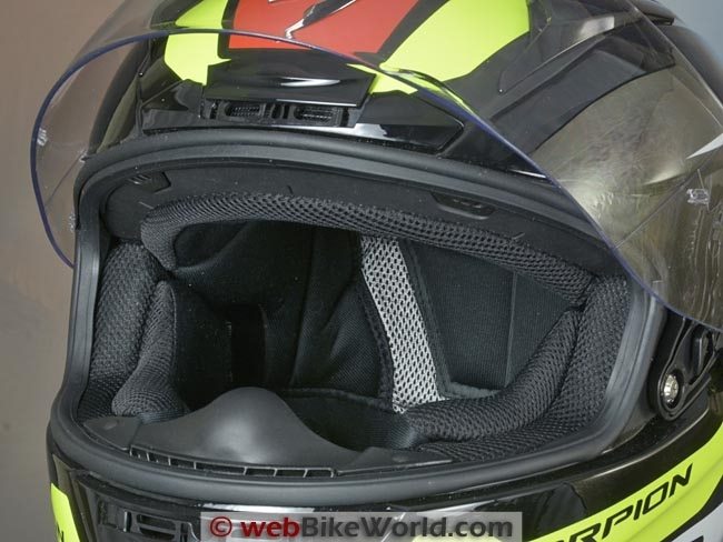 The Scorpion “KwikFit” curved cheek pads, which are tapered at the top to help eyeglass wearers, do a good job and make for a custom-fitted helmet feel.