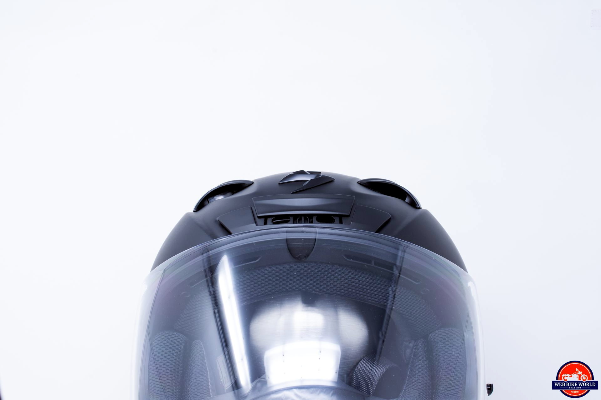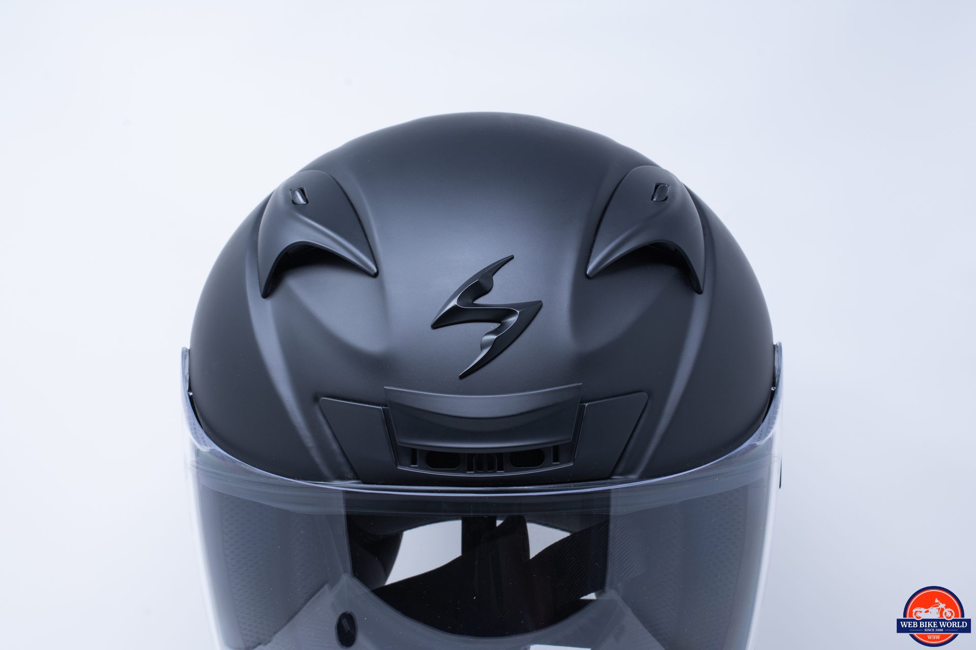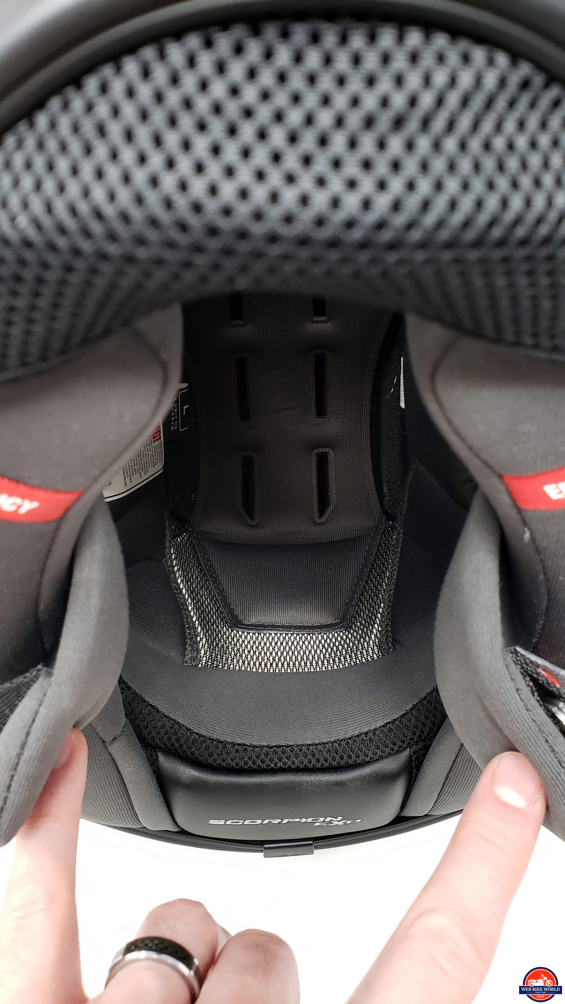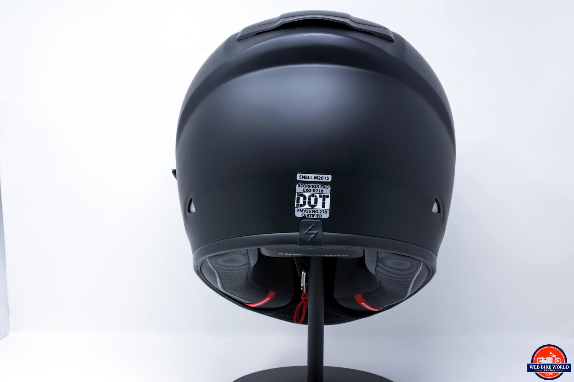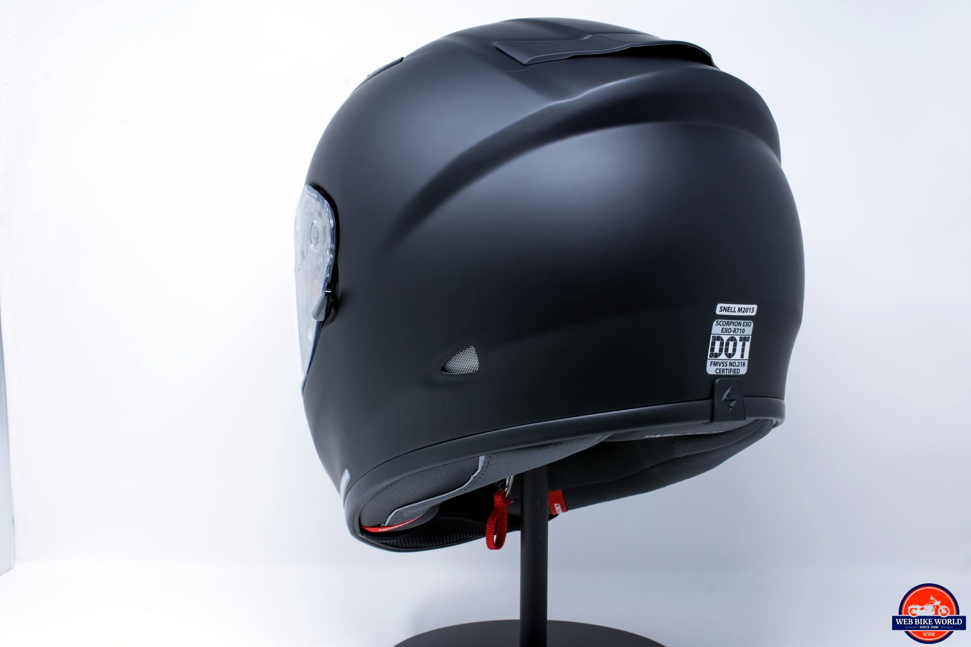 From the rear, you can’t miss the prominent spoiler that masks the exhaust venting near the crown, nor the small triangular exhaust vents near the bottom of both sides of the helmet. You’ll also find a small Scorpion-branded tab dead center, below the DOT/SNELL stickers.