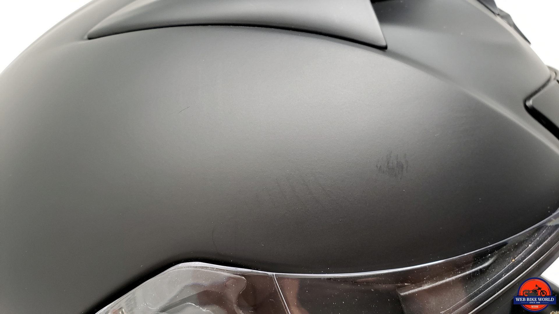 There are indeed blemishes that are present when you inspect it, but these present themselves as sections of finish that are less-matte than the rest. They aren’t white or grey spots of primer (as they appeared on both the Neotec II and C4), just less polished. This is part of the deal you accept when you buy a matte-finish helmet and then choose to ride in and enjoy it.
