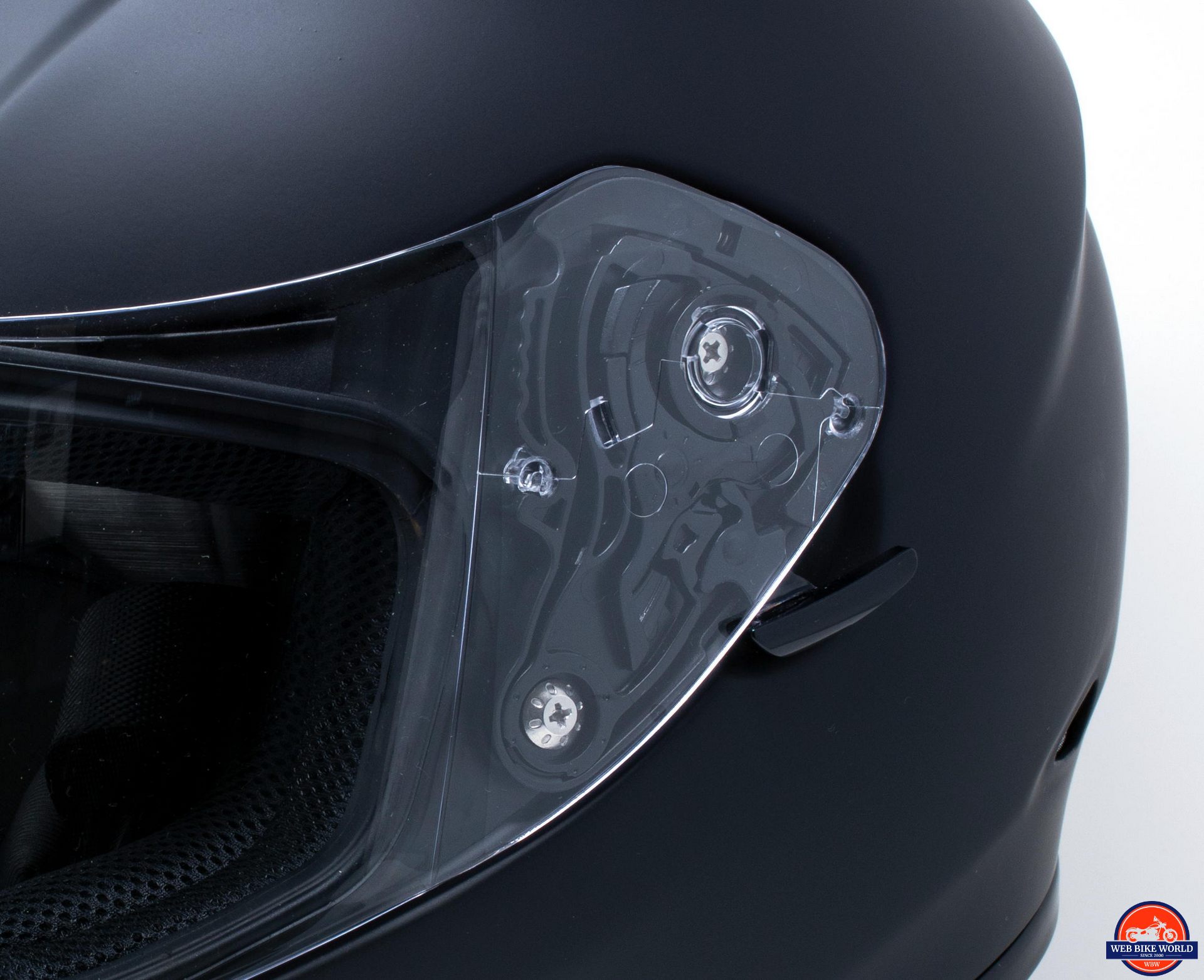 Removal of the visor is extremely easy: with the visor open, simply press the lever on either side of the eyeport down and pop, the visor will fall right off. This lever is the tab closest to the bottom screw. To put it back on, simply realign the plastic tabs on either end (again, in the “up” position) and pop the visor back in.