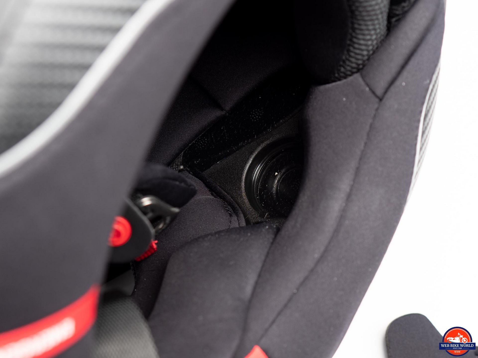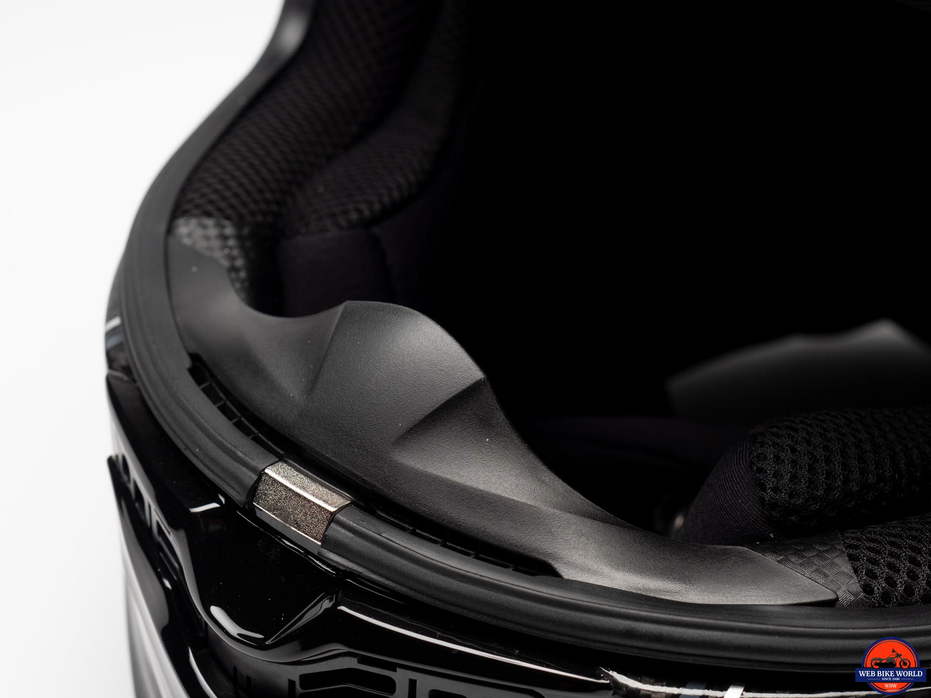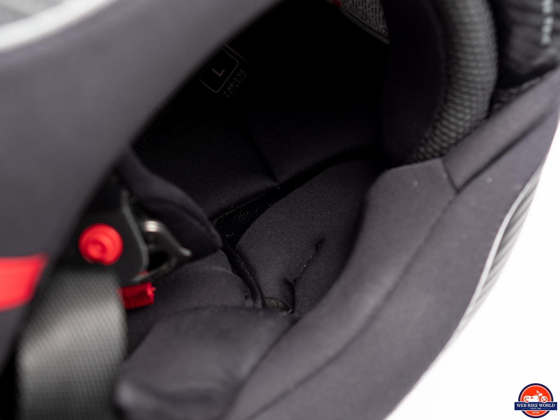 A double D-Ring setup is used to attach the chin strap and the view of the underside shows a carbon fiber “weave pattern” on a portion of the padding. This blends nicely with the weave pattern under the clearcoat of the shell.