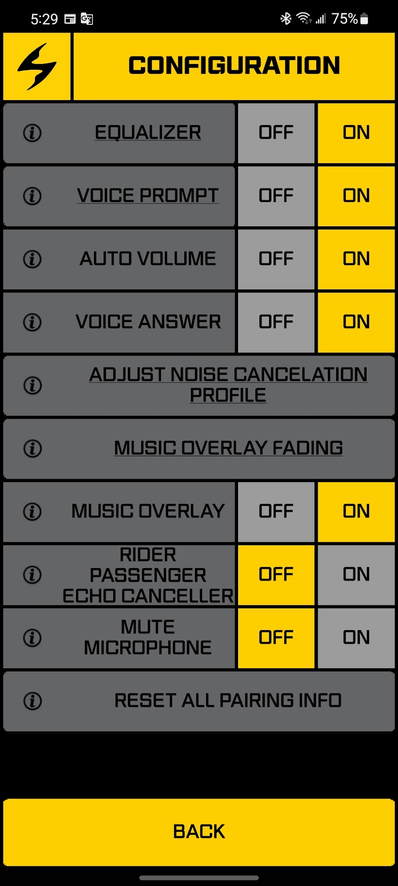 This app is alsoused to adjust the level of noise canceling. This is handled by a simple slider to increase or decrease the noise canceling effect based on how loud your motorcycle is.