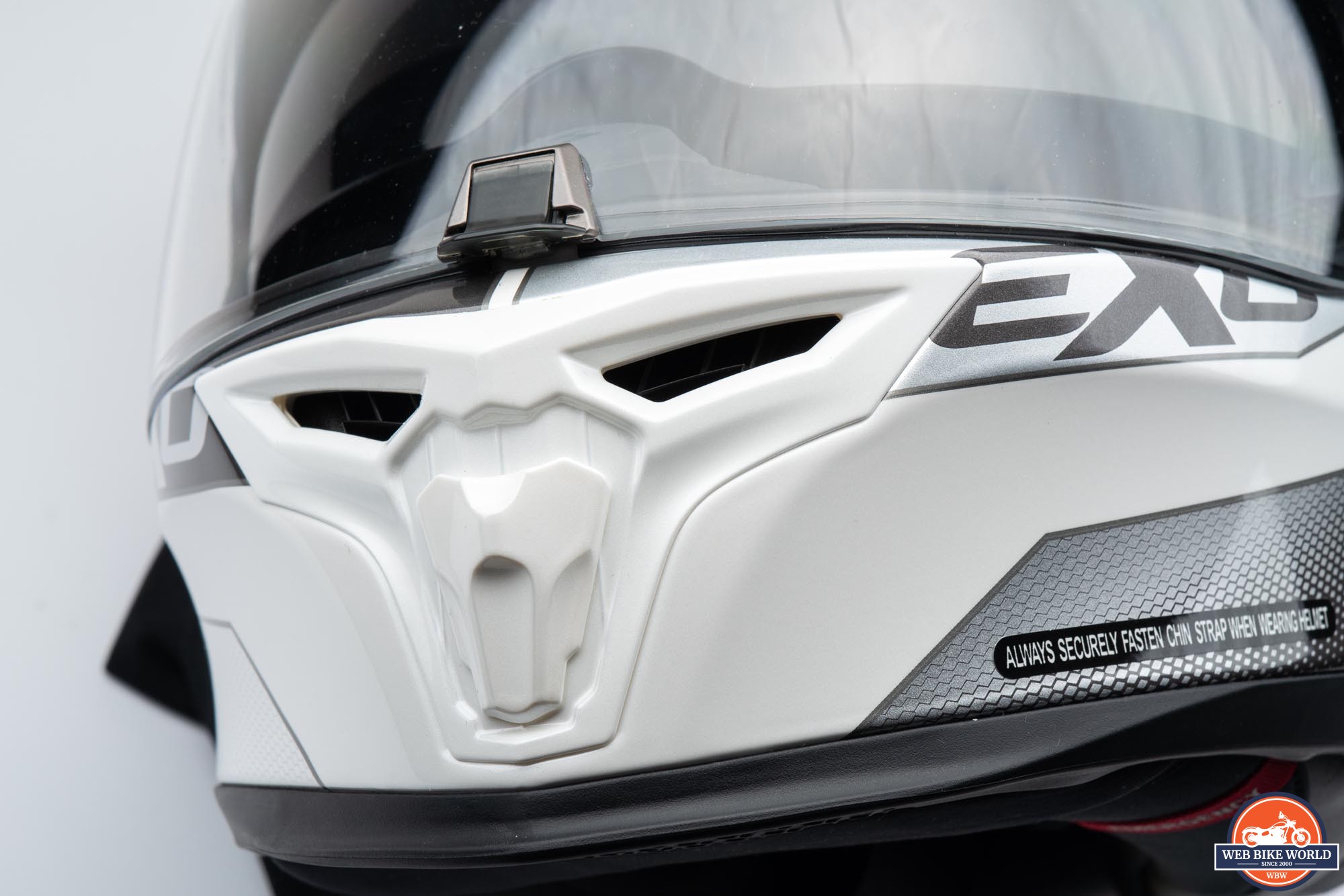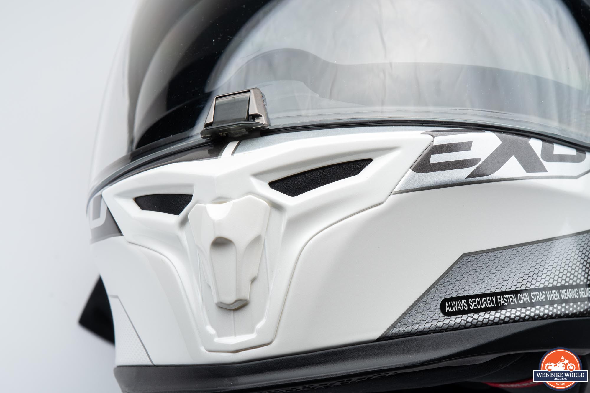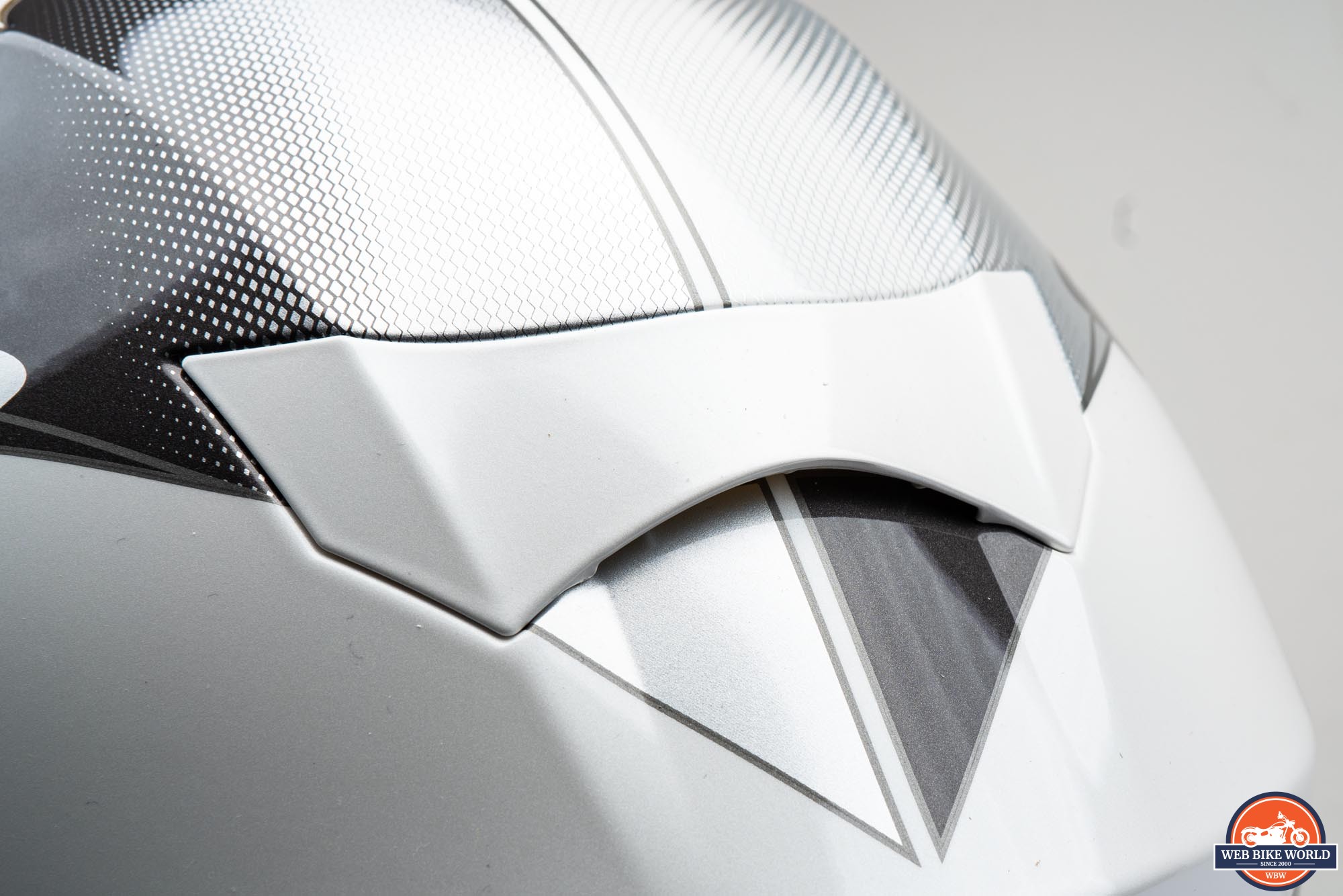 On the outside of the helmet, we have front (chin) and top vent assemblies in white plastic on this colorway. The plastic assemblies are very strongly attached with no wiggle detectable and the overall feel is very robust. Likewise, the rear vent cover, which is also an add-on piece like the front and top vent assemblies, definitely feels like it is there to stay. The fact it has no moving parts makes it feel even more solid.