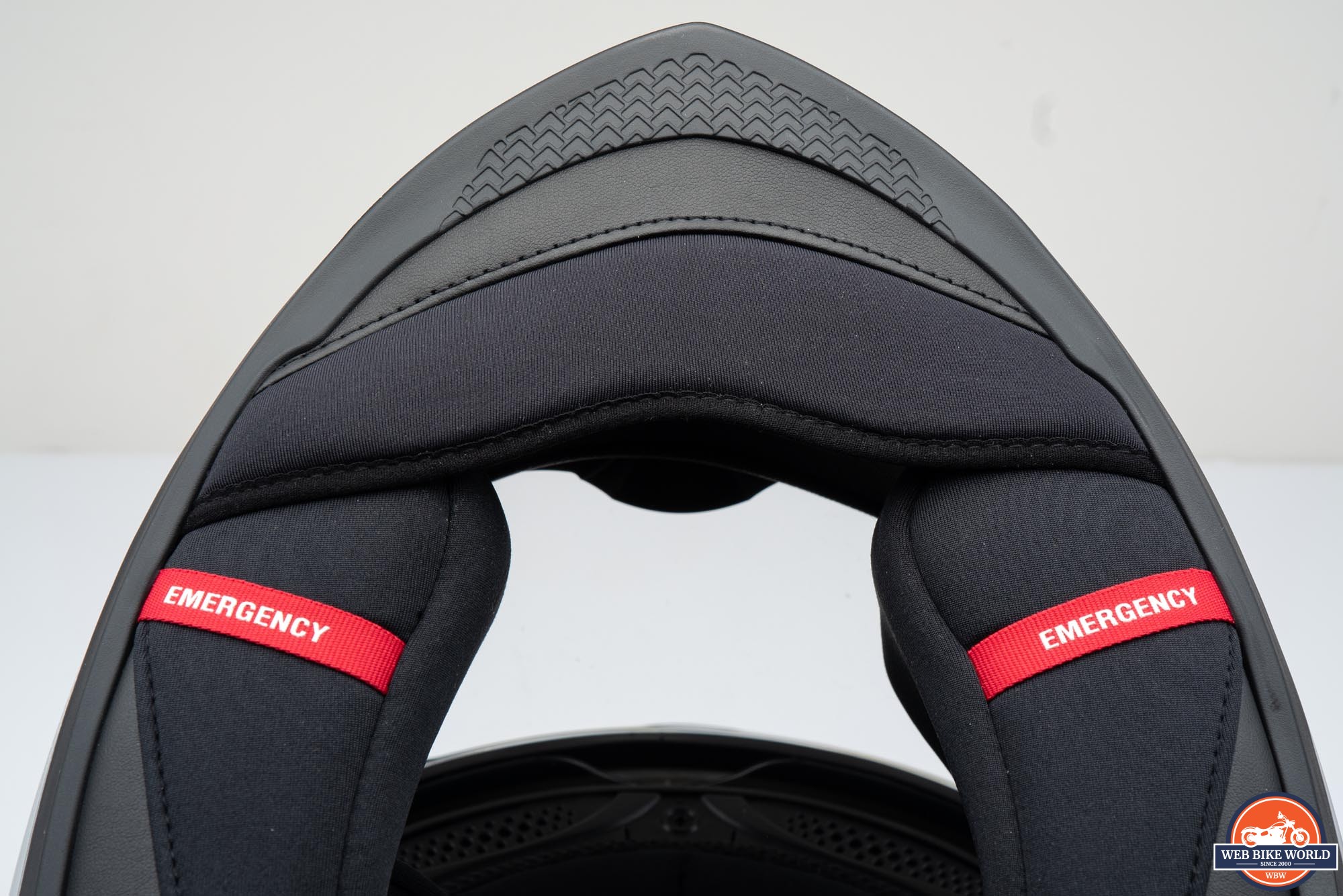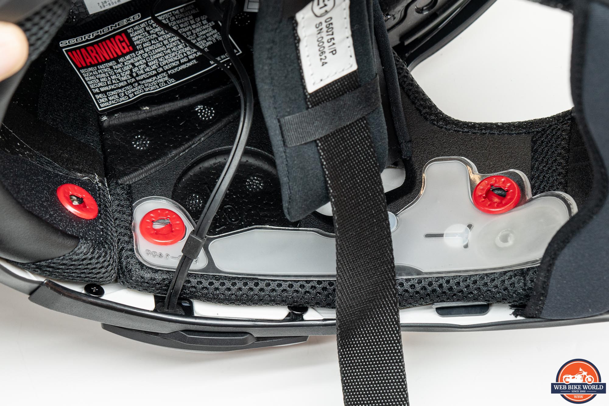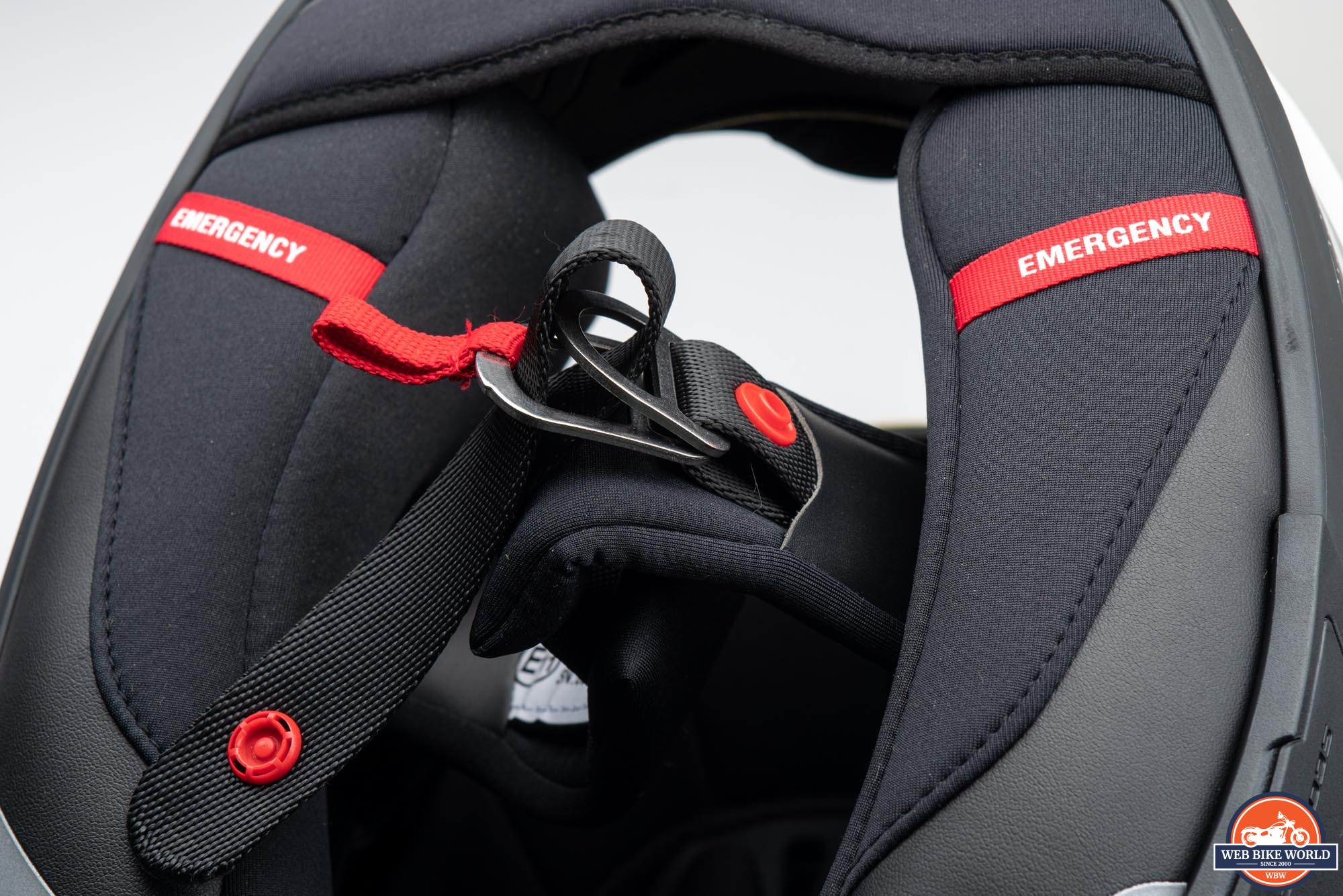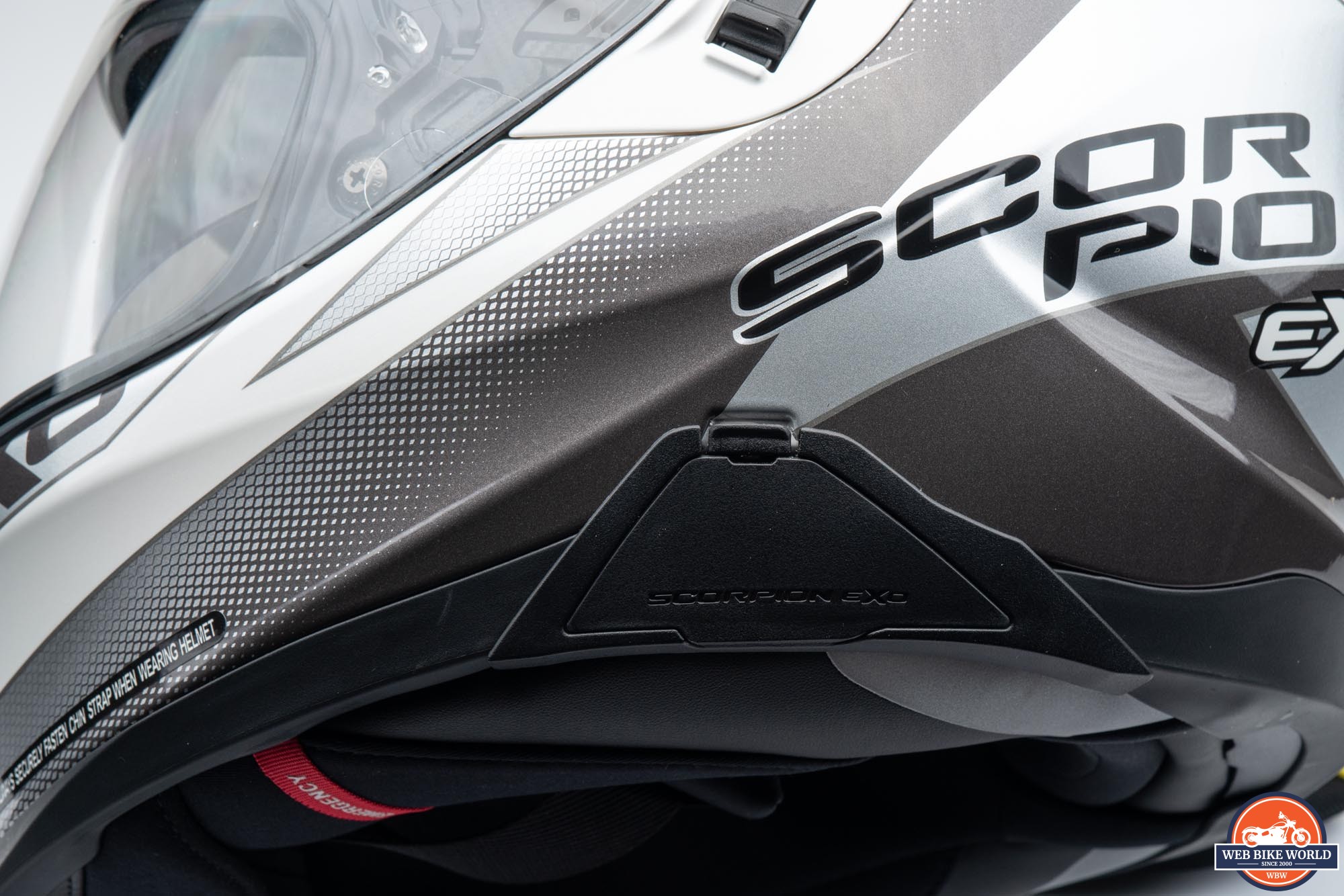 I appreciate that Scorpion includes emergency cheek pulls on many of their full-face helmets. This is such an easy thing to implement and can greatly assist EMTs in removing a helmet by reducing the risk of additional trauma to a crash victim. These pulls allow the cheek pads to be removed from the helmet shell by letting the snap-in pins get extracted from their positions as the pad itself is pulled downward.
