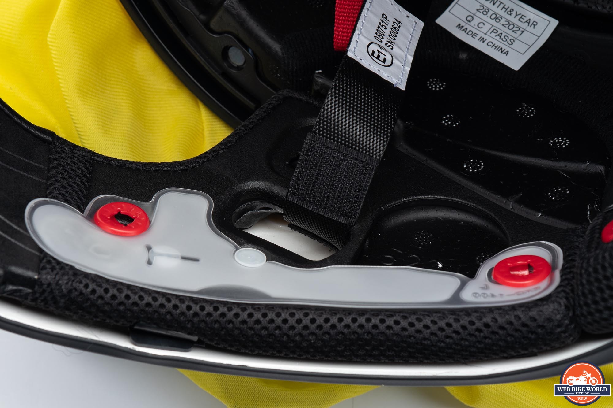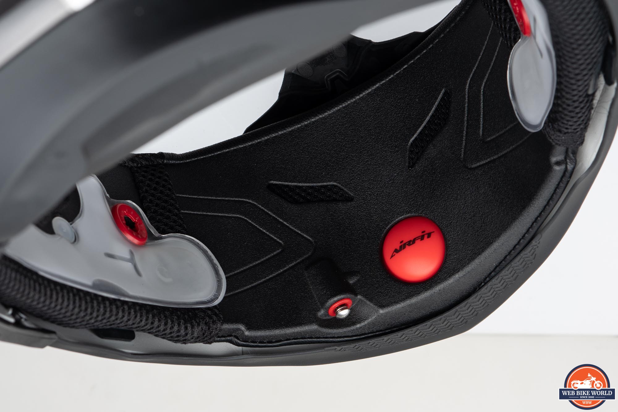 Inside the chin-bar is a large red, rubber bulb and there is an air bladder behind each cheek pad. Presson on the bulb inflates the bladders and snugs the fit at the sides. This can help ensure a good fit and it can also extend the useful length of time the helmet fits well as the padding wears over time.