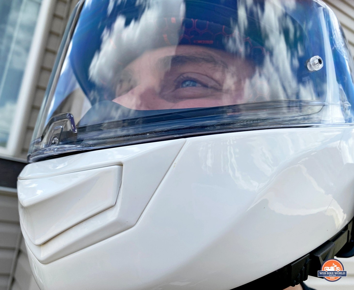 I was initially unimpressed to see the large nose cutout in the center of the sun visor lens because I figured bright sunlight would invade through the opening and my light-sensitive eyes would hate it. As I spent time riding with it in the lowered position, that anticipated irritation from bright light happily never came to be. In fact, I was better able to see my gauges through that untinted gap when I glanced downwards.