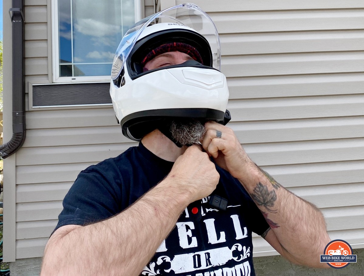 I installed the non-boom style mic on the inside of the chinbar as I prefer to do with my Sena devices. I tried unsuccessfully moving the mic’s location around the chin bar to find a place to place it where the swirling air coming in from the vent wouldn’t get picked up as flapping and booming to whomever I was talking to via intercom/phone calls. I didn’t try using the boom mic to rectify this problem because I don’t like fighting with it for space inside my helmet. Using it might possibly have cured the issue, but I’m not sure.