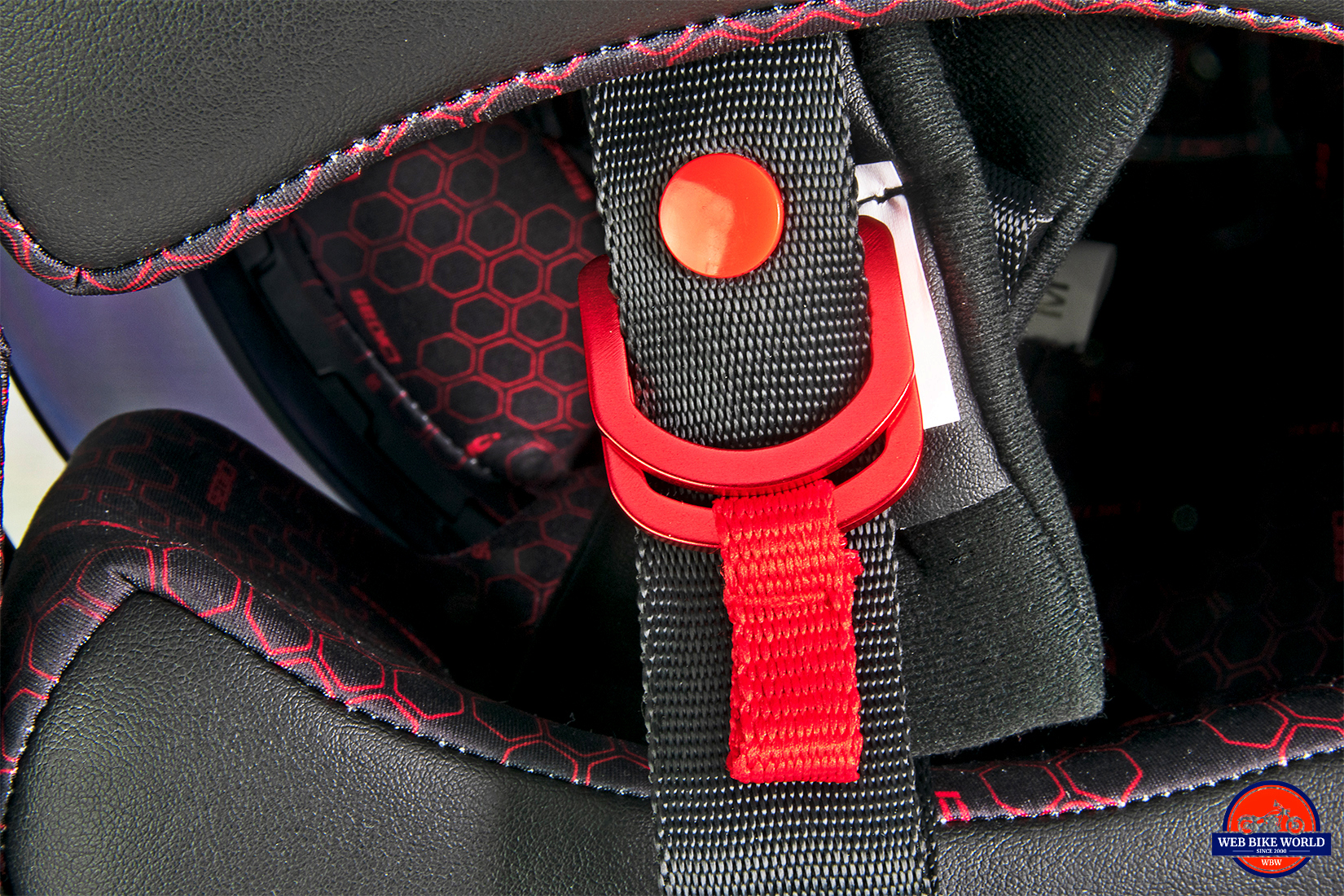 This helmet comes with a strikingly bright red, double D ring type of chinstrap closure. It works well along with the extra snap on one side to secure the extra length leftover after it’s pulled tight under my chin.
