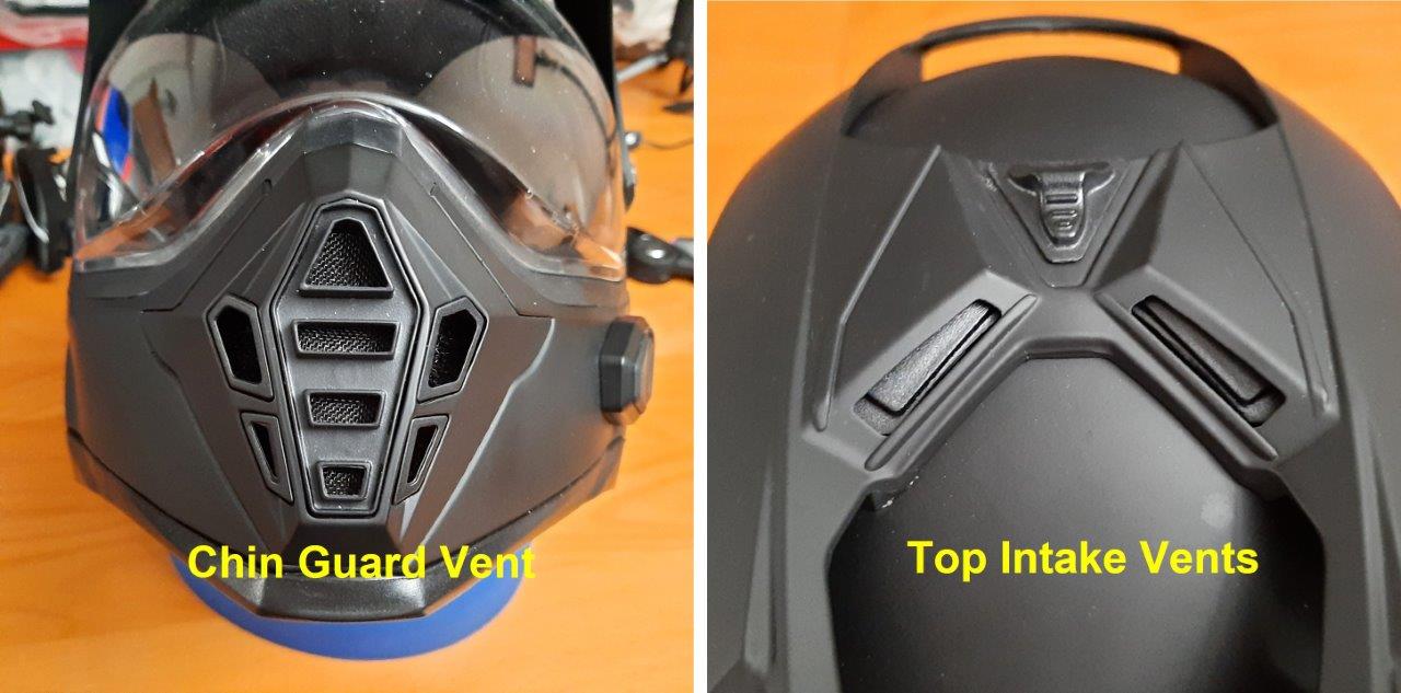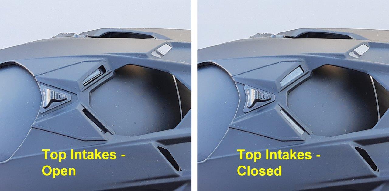 Despite a stylish and low profile external approach to providing front and back intakes, these intakes don’t work well. The top adjustable (open or closed) front horizontal intakes are not well placed for optimal air capture, do not seal completely nor open fully (a couple of millimetres) or directly channel air into the port in the shell.