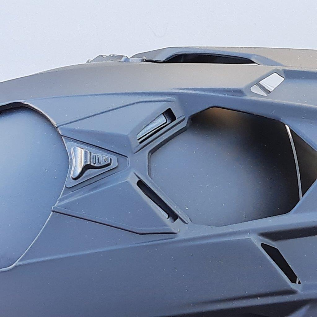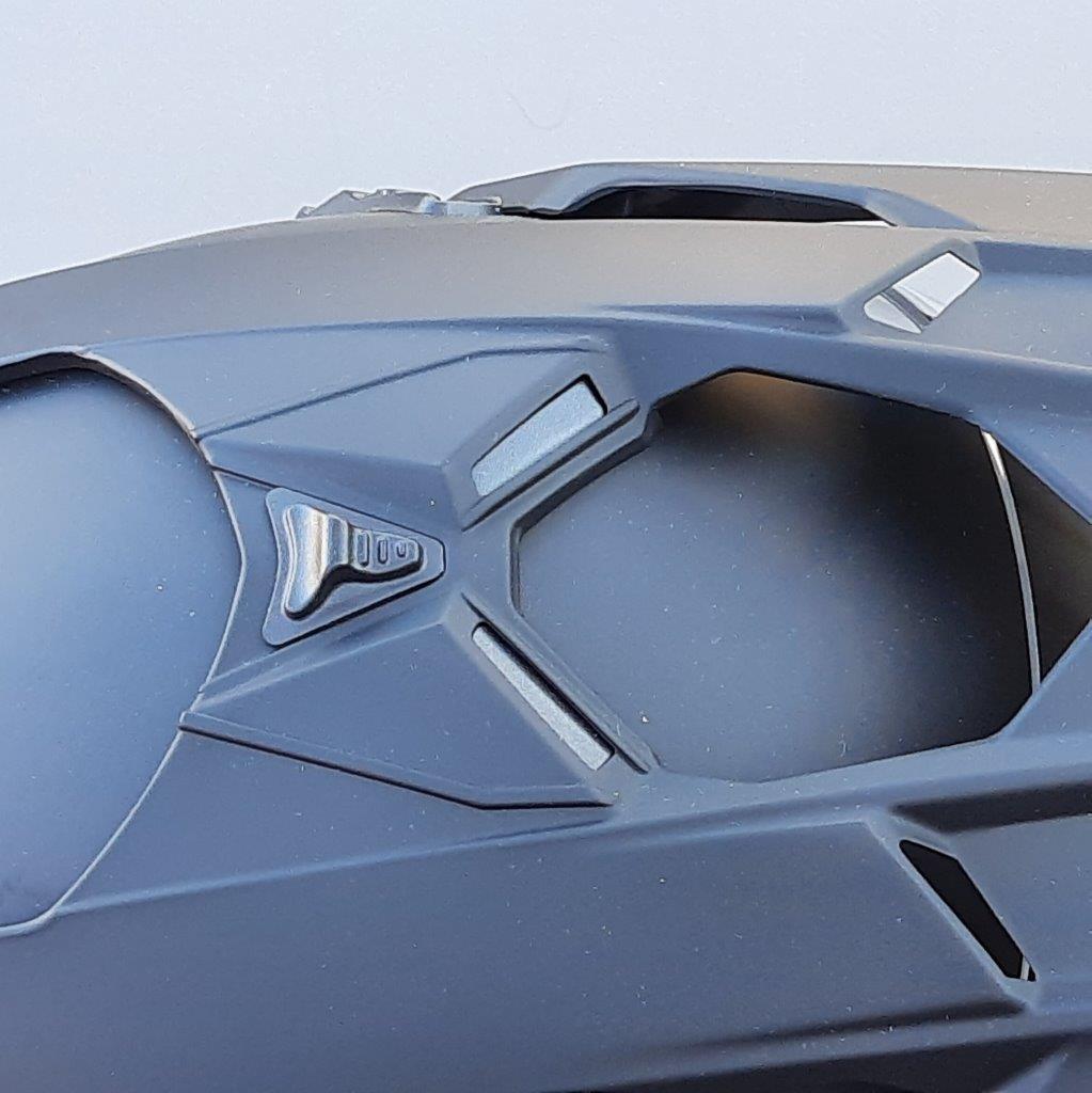 The long-styled peak also houses the top open/closed intakes and rear exhaust vents. With this design and layout approach the peak component becomes an integral and important part of the overall and if removed or damaged for some reason the helmet ventilation strategy would be very much impacted.