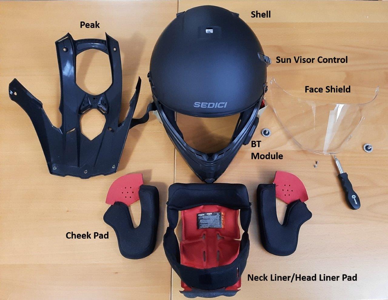 The full-face shell of the Sedici Parlare Adventure Helmet is formed of injection molded ABS with a fitted multi-part EPS (crushable foam) inner liner. The outer chin bar sections are not covered but most of the inner sections have a black finish or covered with material, such as along the brow. The chin vent insert is a shaped plastic piece that fits in with the liner sections.