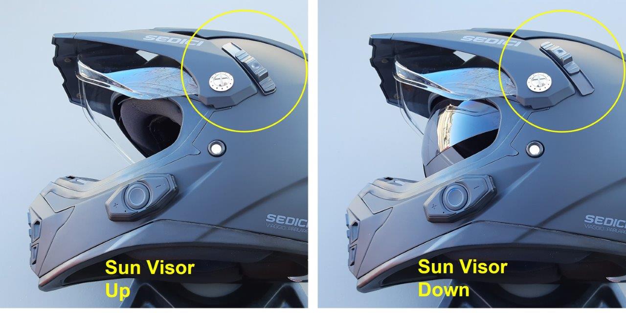The slider for the sun visor sits immediately behind the back edge of the peak and mounting hardware on the left side and is quite easy to reach.