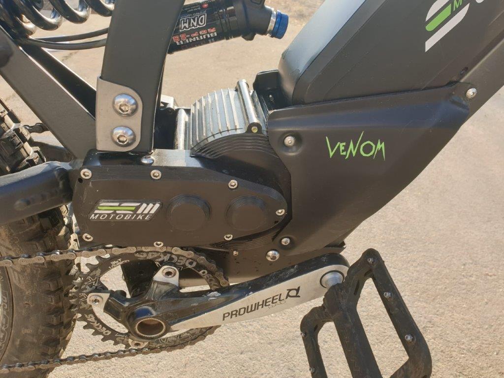 The bike comes in two sizes—medium and large. The motor was designed by SEM and is a load-bearing part of the bike milled from solid aluminum. The motor is independent of the pedals and is controlled on the handlebars. You can switch from 2,000 to 4,000 watts. The battery is another SEM-specific component. It is designed and wired specifically for the bike. It’s a 52 volt 17.5 Ah battery. It takes around 4.5 hours to charge.