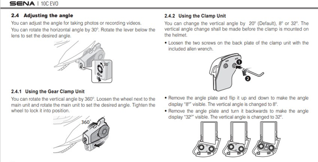 Mounting Components – the Sena 10C EVO comes with three mounting pieces to accommodate fitment to almost any full-face, modular, or three-quarter/Jet-style helmet. The three pieces are the gear clamp with a rotating bezel camera mount, a standard clamp mount, and an adhesive base mount.