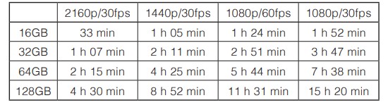 The following table, grabbed from the Sena 10C User Guide identifies approximate recording time using different capacity media relative to resolution and frame settings.
