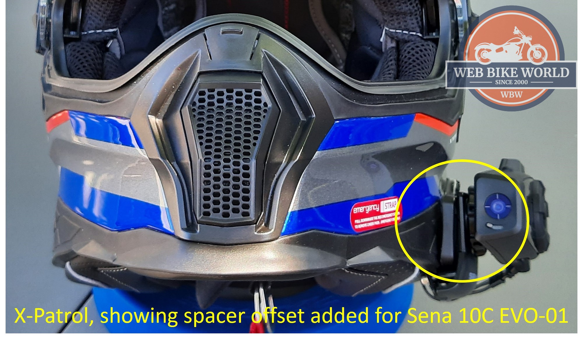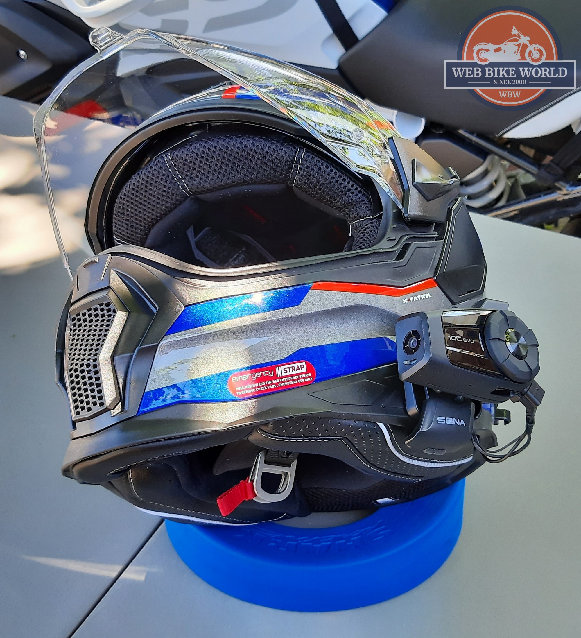 NEXX X-Patrol – with the UClear Motion Infinity system removed temporarily to facilitate installation of the (B) type SENA HD Speakers (reviewed), the thin-wire microphone from the kit is fitted into the helmet and with a 3M Dual Lock pad already in place the 10C EVO module is snapped onto the helmet and the orientation adjustments done as the first mounting option.