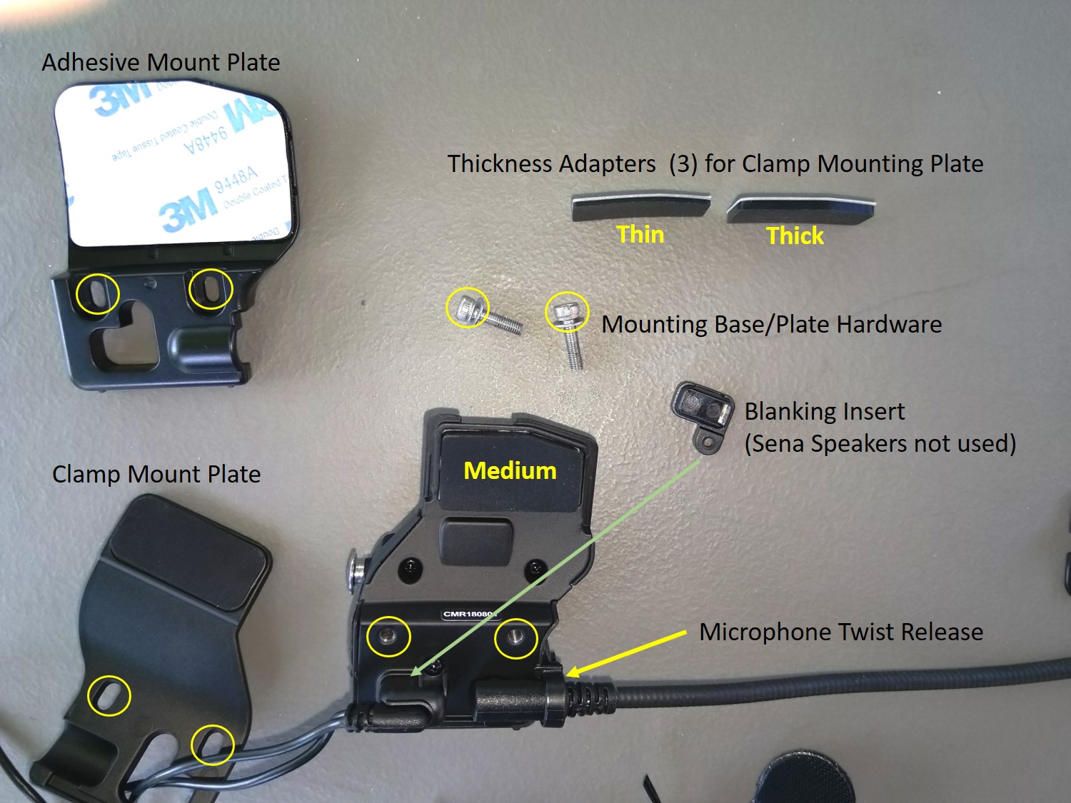 Where some systems use external in-line connectors for mounting the microphone and speakers, Sena uses 3.5mm and 2.5mm connectors plugged into base ports and secured with a twist-n-lock and screw mount for the microphone and a plate with screw for the audio connector. It’s very solid and secure, although the plate and base typically need removal for access.