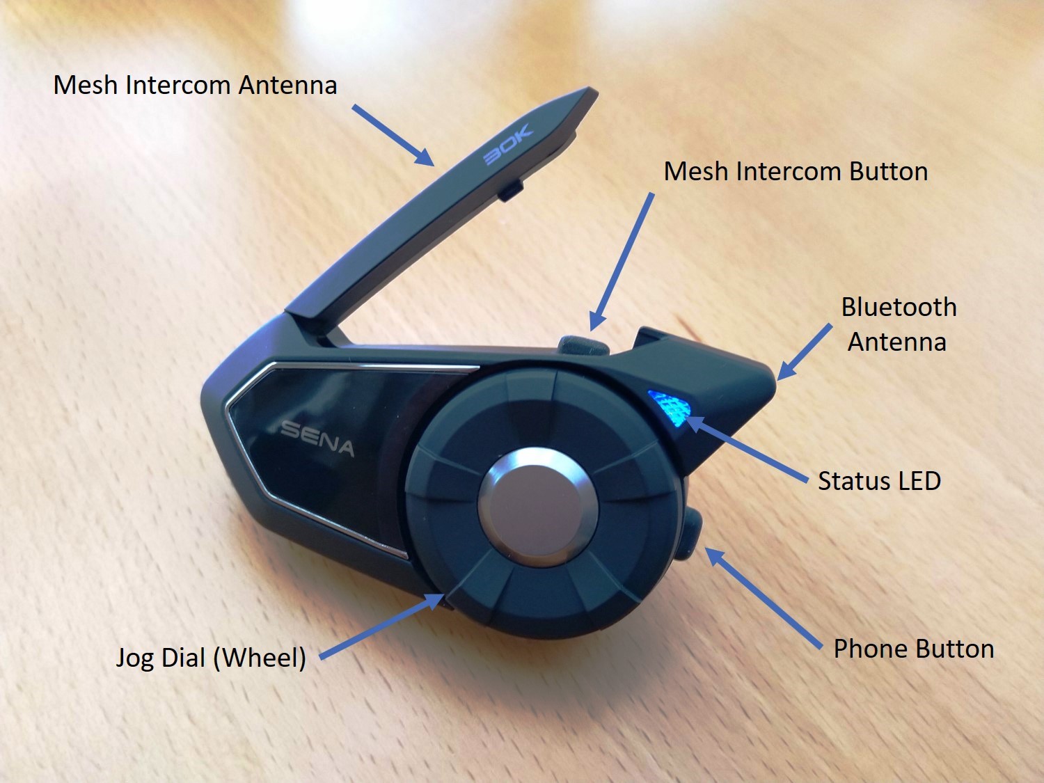 ‘Buckle Up’ – to turn the Sena 30K system on, press the (back) Phone and Jog Wheel buttons for one second. “Preparing Headset” is heard first, then an ascending multi-tone cue followed by beeps as services activate and devices connect (if paired), “Phone Connected” is heard.