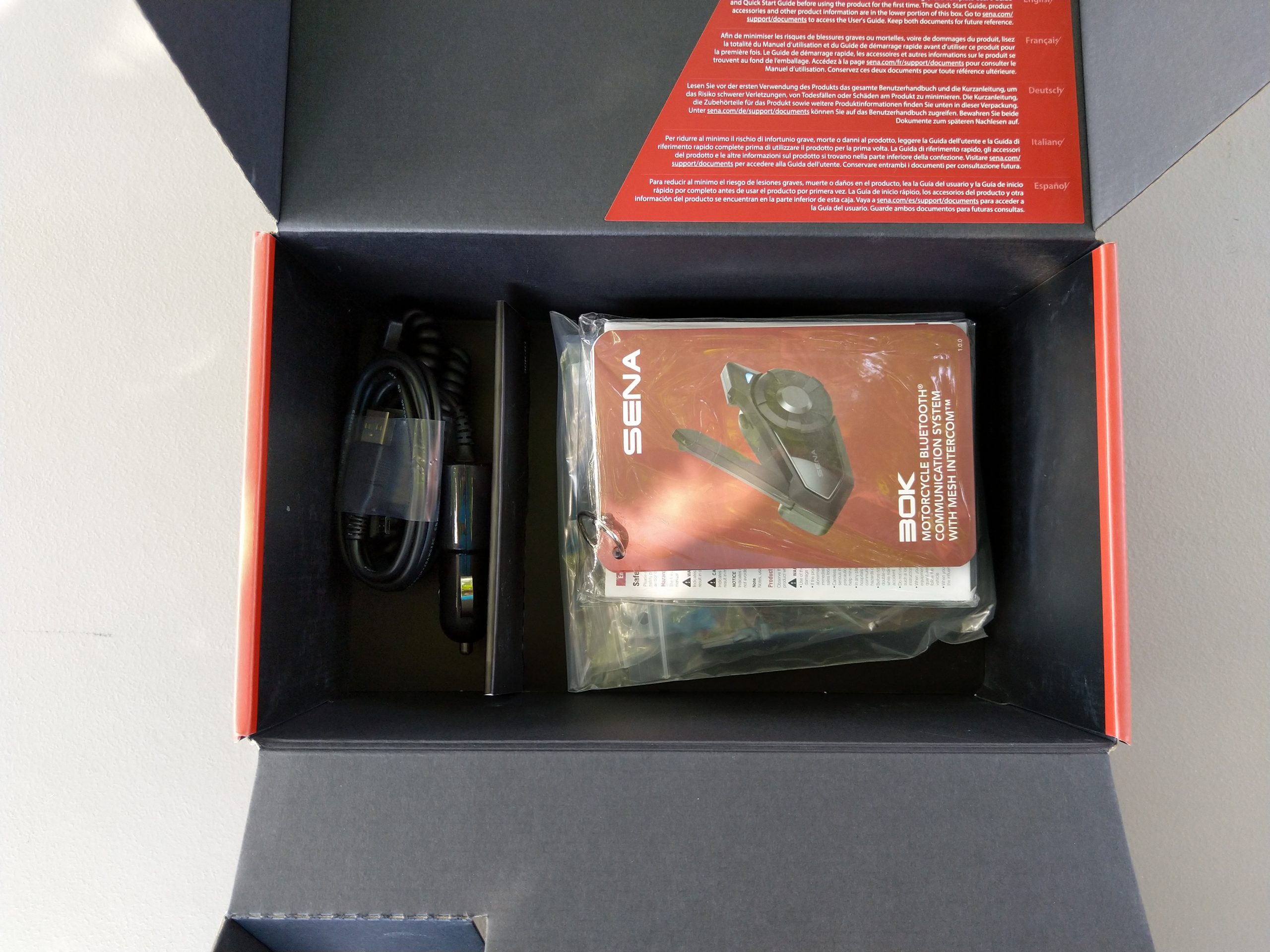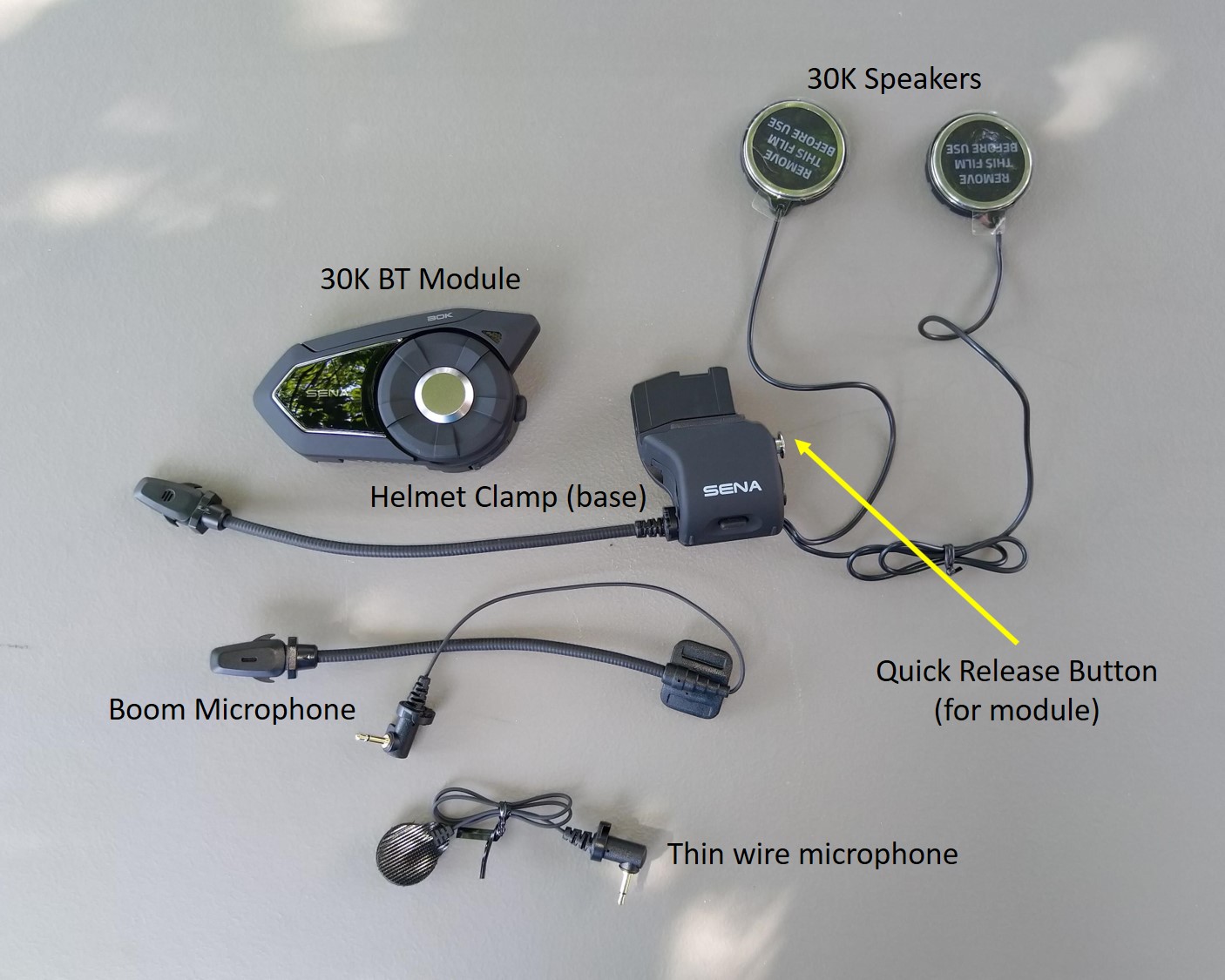 The listing: 30K main BT module, Universal Helmet Clamp or base with quick release, wired boom, thin wire (flexible) microphones, Adhesive Mount Adapter plate, foam speaker covers, hook-n-loop fastener pads for boom and wired microphones, microphone sponges (covers), foam speaker covers, speaker repositioning rounds, 3.5mm to 2.5mm auxiliary stereo adapter cable, micro-USB to Type A data/power cable, car adapter charging cable, and pocket-sized flip-style multi-language Quick Start Guide.