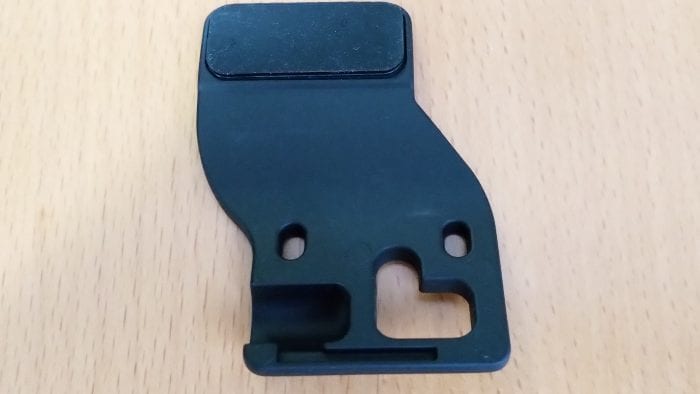The adhesive-backed hook section (with centre cut-out) is prepped and laid into place on the shaped slightly recessed area on the back of the 50R module. Make sure both adhesive pieces are pressed into place and always work around the edges as well. They should be left to cure for a few hours or overnight if patience permits.