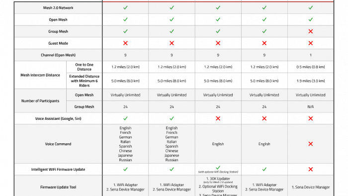 The table below from the Sena website provides a very good compilation of the features, functions, and compatibility points of Sena Mesh and now Sena Mesh 2.0 capable systems.