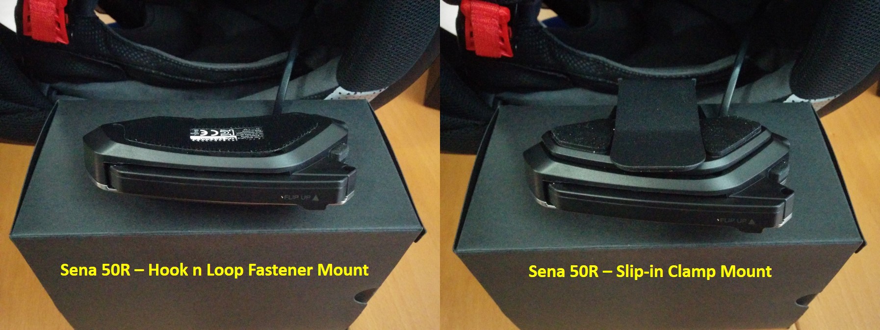 These pieces provide the simplest and closest fitting mounting option for the sleek Sena 50R. After peeling off the cover of the adhesive-backed loop (brush) piece, it is laid in place on to the helmet shell and pressed down firmly.