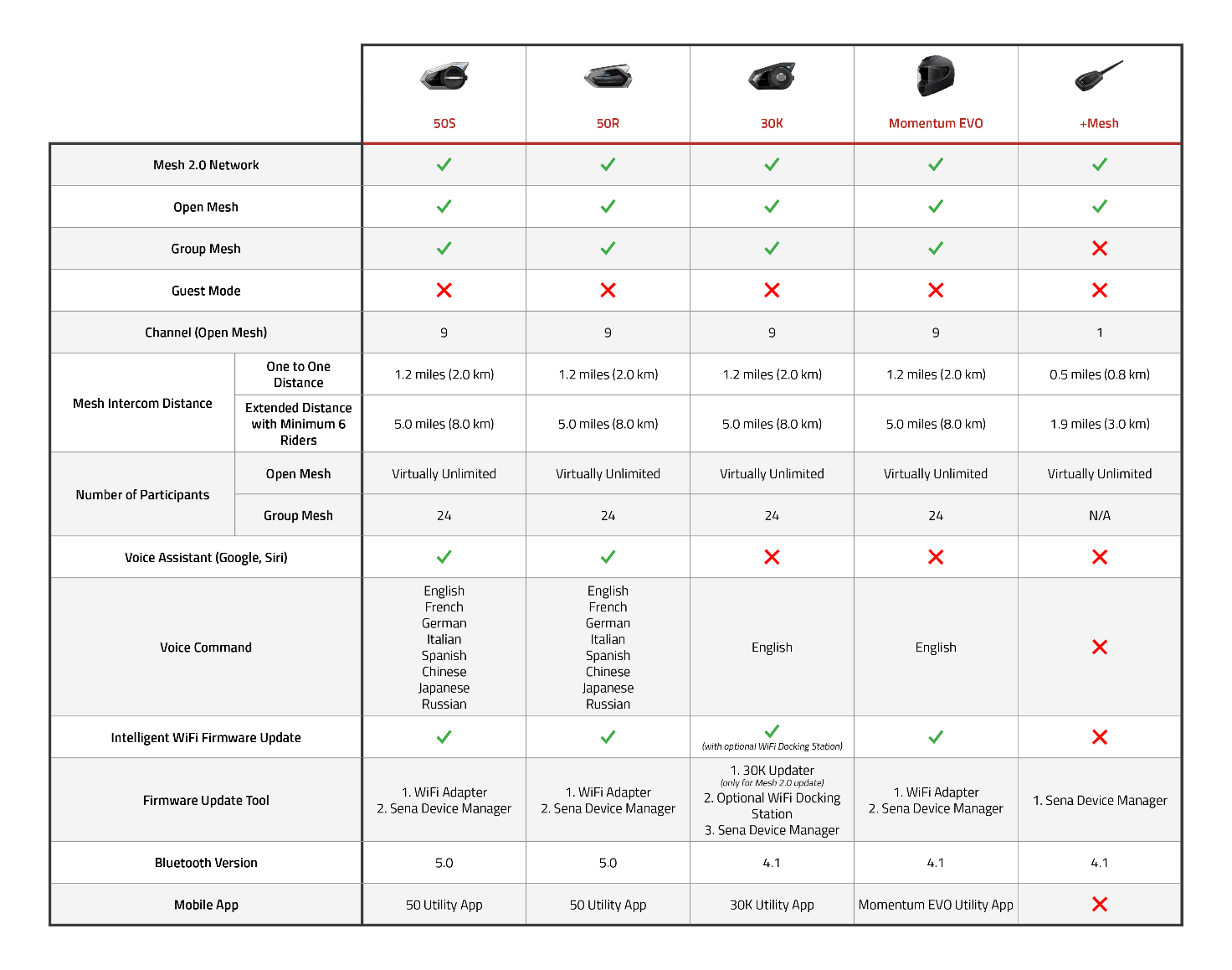 The table below from the Sena website provides a very good compilation of the features, functions, and compatibility points of Sena Mesh and now Sena Mesh 2.0 capable systems.