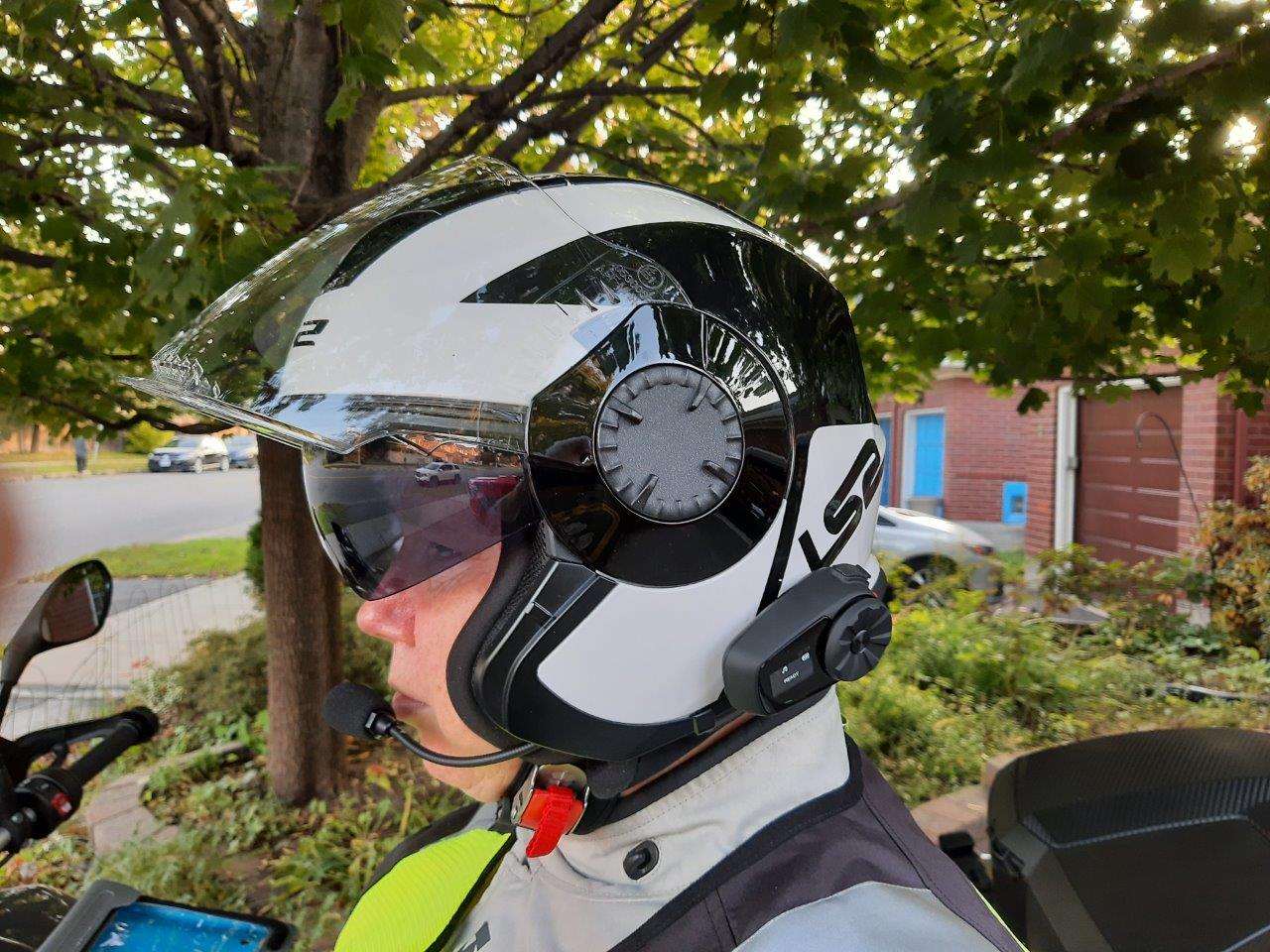 Both this and the Shoei J-Cruise II with its integrated Sena/Shoei SRL2 BT system are valued three-quarter helmets; one for her, one for him respectively. But the LS2 Verso has more flexibility when the swapping of BT systems is need – quite frequently around here.