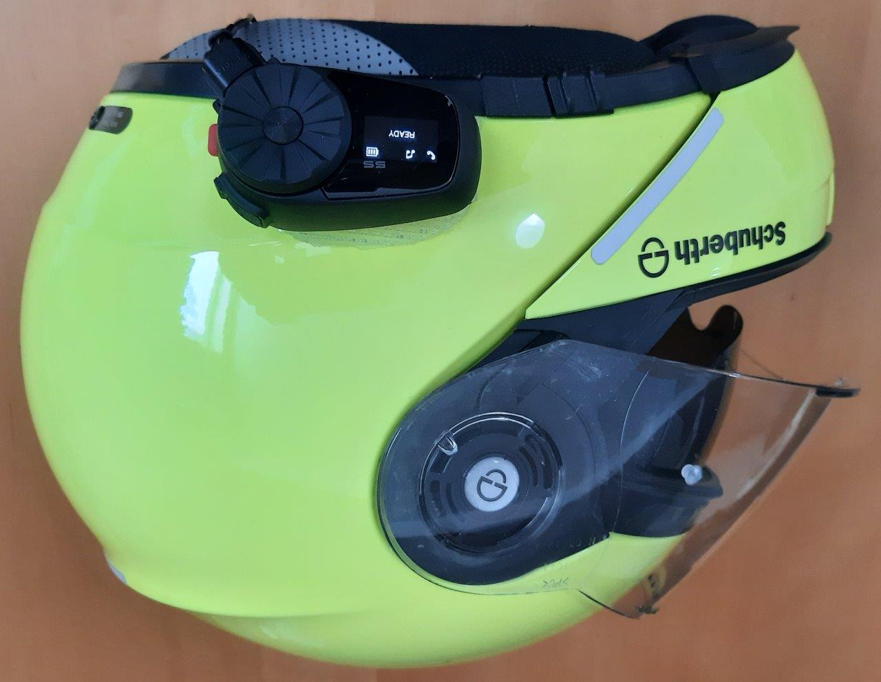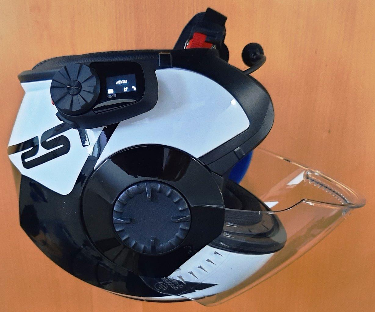 The headset connector runs out from the left rear side and is not in the way when the helmet is put on or taken off, and with the adhesive plate mount positioned so the front point is just below the centre of the sun visor action wheel, letting the adhesive cure for a few hours, then adding the 5S module and making the headset connection is that remains to be done.