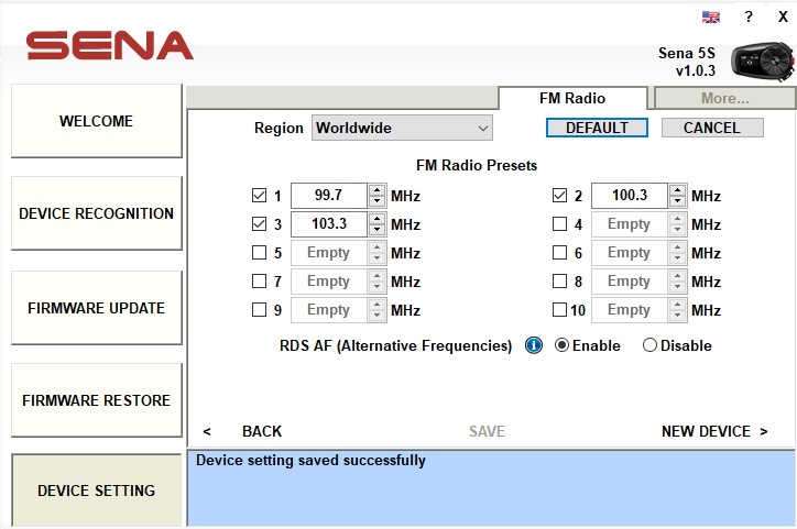 And like other Sena systems with the full meal FM radio deal, the Sena 5S FM Radio feature is manageable from the Sena Device Manager, the Sena Utility App by selecting the upper left corner Menu bar and then the FM Radio listing or, through direct interaction via the system controls.