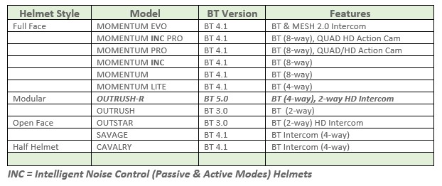 The expanding Sena Smart Helmet lineup for motorcycling use comprises full-face, modular, open-face, and half helmets. The current listing is summarized in the following wBW table: