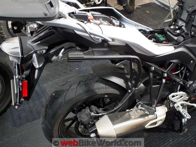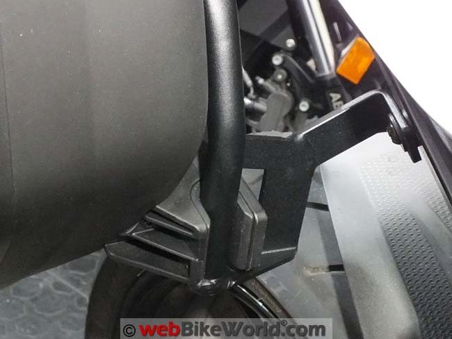 Forming a nearly 90-degree angle, each 3P bracket mounts to the left and right points on the S1000XR that are also used for the BMW side bag mounting frame.