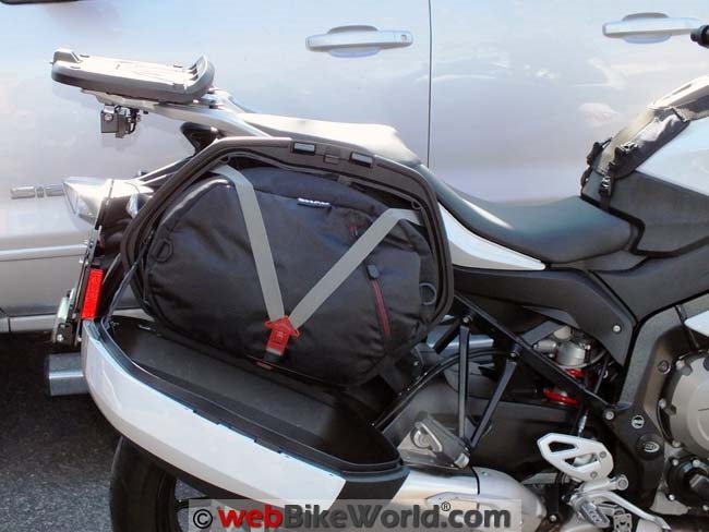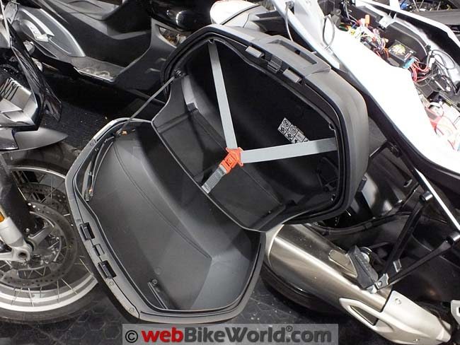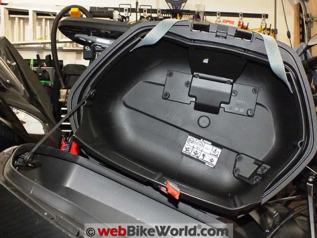 This deck, along with the included three-point elastic strap inside the SH36, minimizes the tendency of stashed luggage to topple out or shift when the side-mounted case lid is opened.