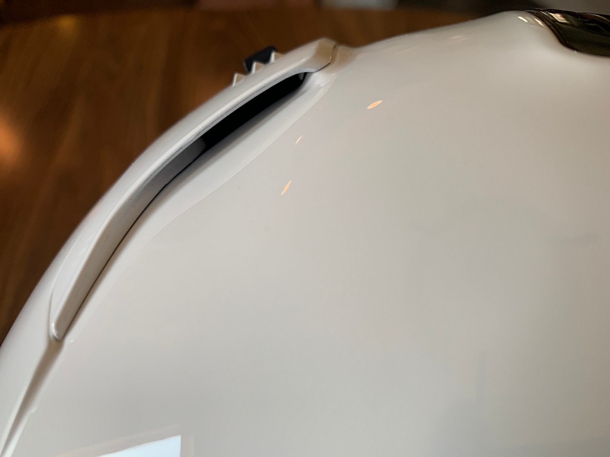 With the low-profile rear spoiler firmly attached just aft of the sun shade slide, it looks pretty racy. I expect that should help some with lift also at speed. The lower edge of the helmet has a hard rubber edge that turns under. This would make it harder to attach a communication device but it can be done. Otherwise, you could attach it with the adhesive back option. I positioned mine a little further back than is optimal with the boom mike but there was more room for clearance of the chin bar further back on the helmet.