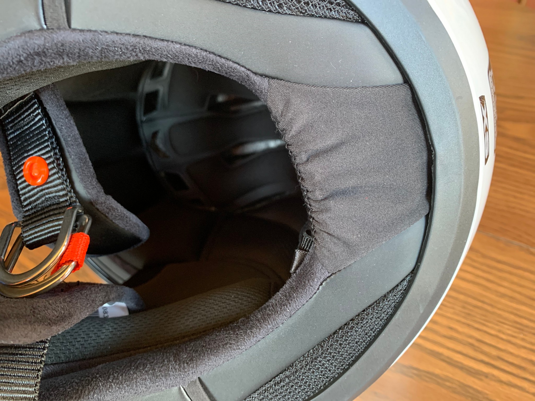 Also unique is the design of the neck roll. The surface next to your skin is very soft and there is soft elastic around the back that holds it close to your neck. Most neck rolls have a gap in that area that can be a source of noise on the road. It is not the thickest as neck rolls go, however. It only measures 1.5 inches which is a full inch less than the one on my very quiet RPHA helmet. We’ll have to see how that affects the noise level.