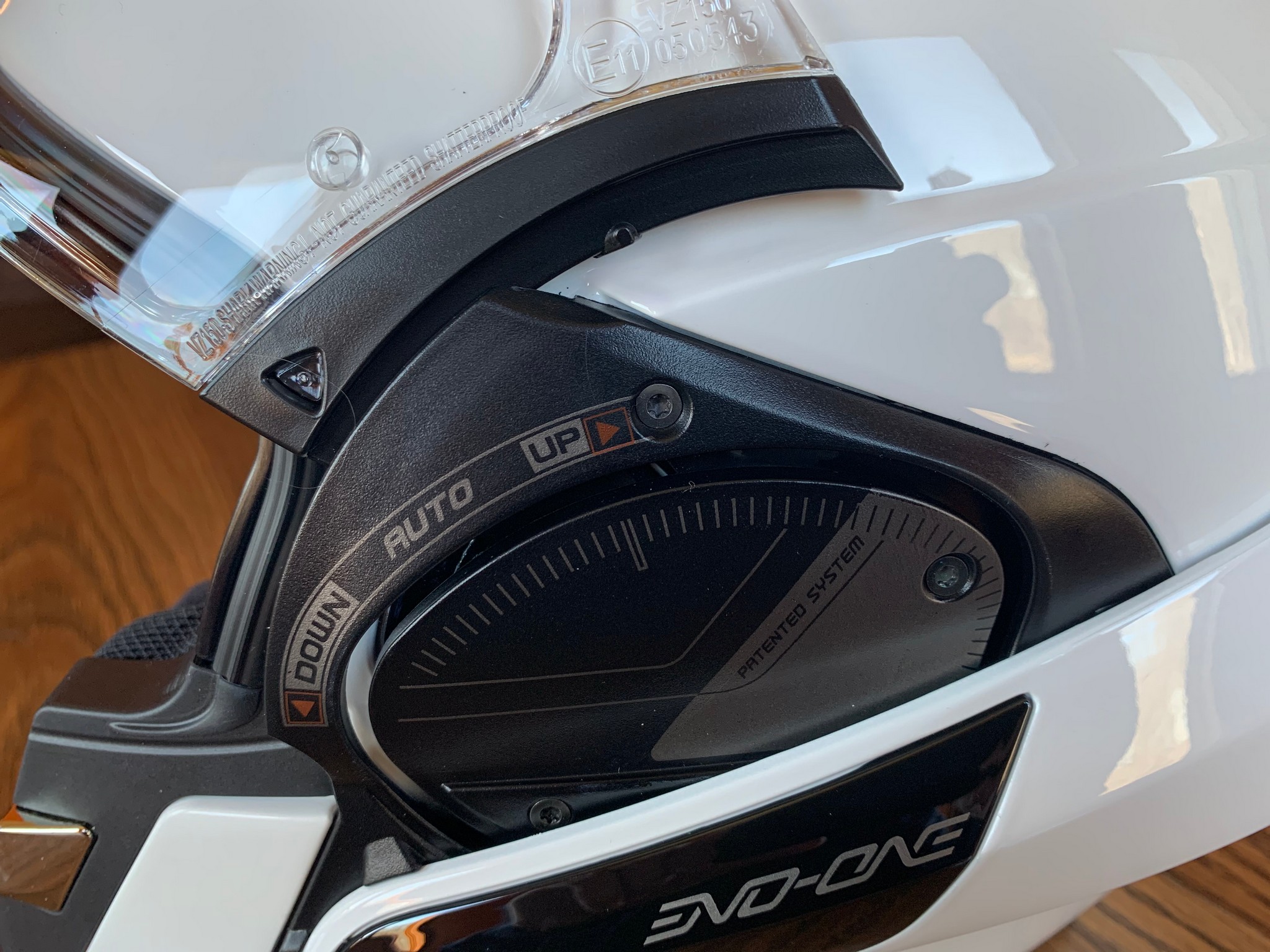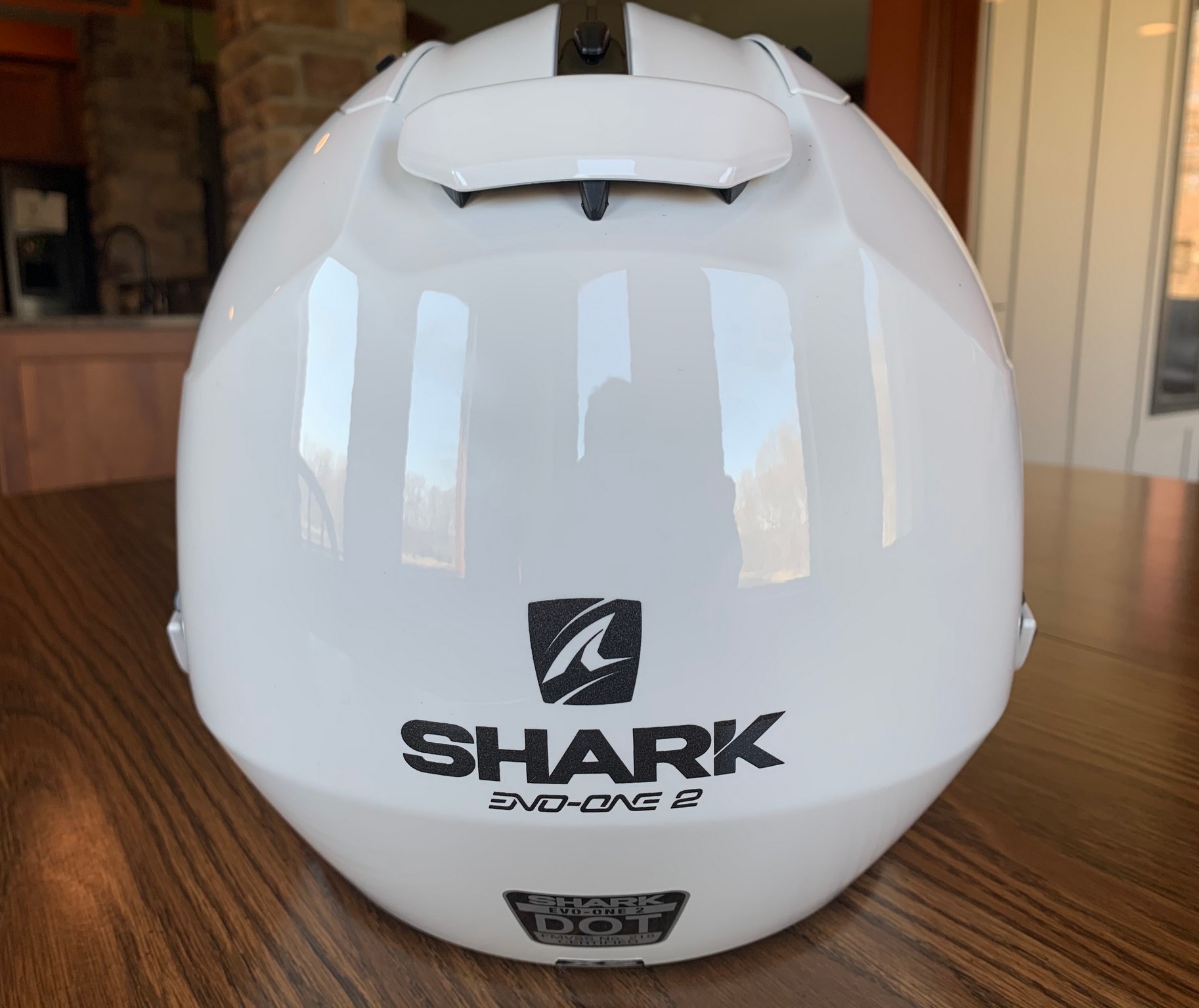 This EVO-ONE 2 sports a fairly compact, aerodynamic, injected thermoplastic resin shell with 2 shell sizes. I like the lines of the helmet and the minimal front and back branding. The side plates are a new design that bring to mind a tachometer lending to the feeling of speed I’m sure Shark was trying to evoke in the lines of the helmet and the rear spoiler.