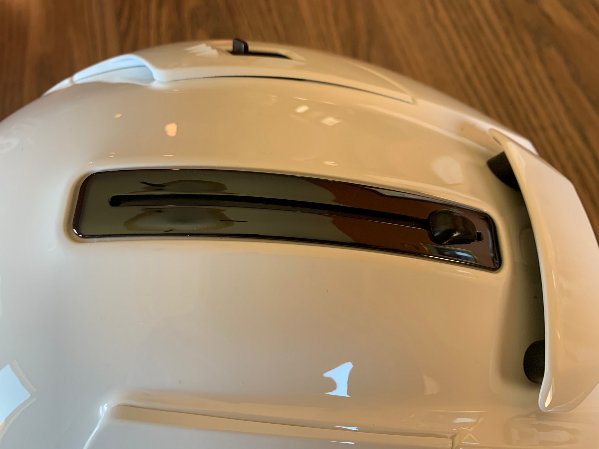 I can see right off that this is a well put together helmet. The paint is well applied with no visible blemishes, tolerances are very tight and the minimal graphics were well applied with barely discernible edges. The vent switches were smooth and tight and the slider for the drop down sun shade has the smoothest action I’ve ever seen. It’s got a small air foil in the back that is straight and firmly attached. I can’t find any loose parts or threads. So it gets an excellent for quality fit and finish.